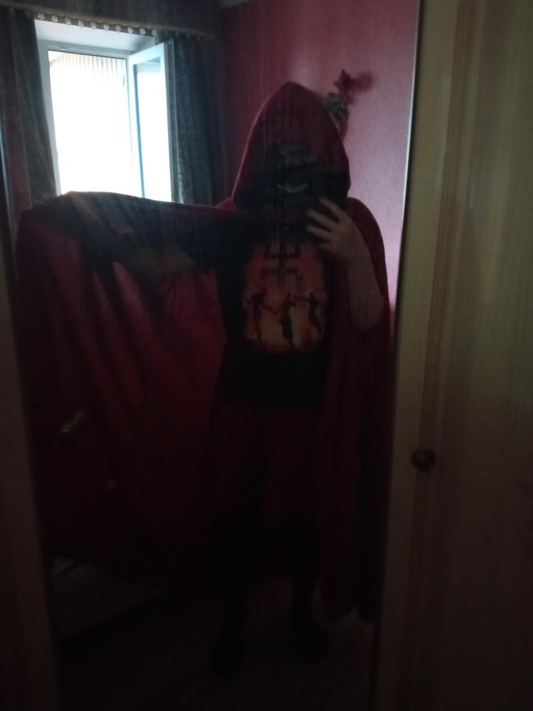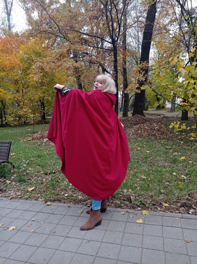 Самое то для косплея Красной Шапочки xD Смотрится довольно эксцентрично, но вы знаете, что делаете, заказывая такие вещи. Плащ широкий, где-то на уровне локтей прорези для рукавов, если они вам нужны. На шее застёгивается на пуговицу, держит очень крепко, но не настолько, чтобы задушить. Хорошая альтернатива кожанке на температуру -10. Цвет ярко-красный; в реале вещь смотрится довольно дорого. Заливаю, что это ручная работа по индивидуальному заказу... Пока верят.