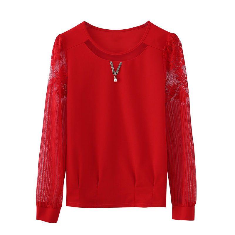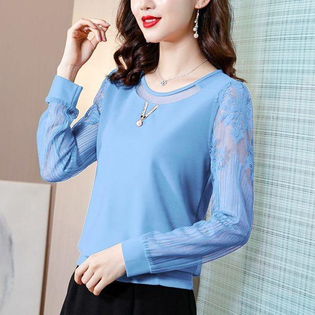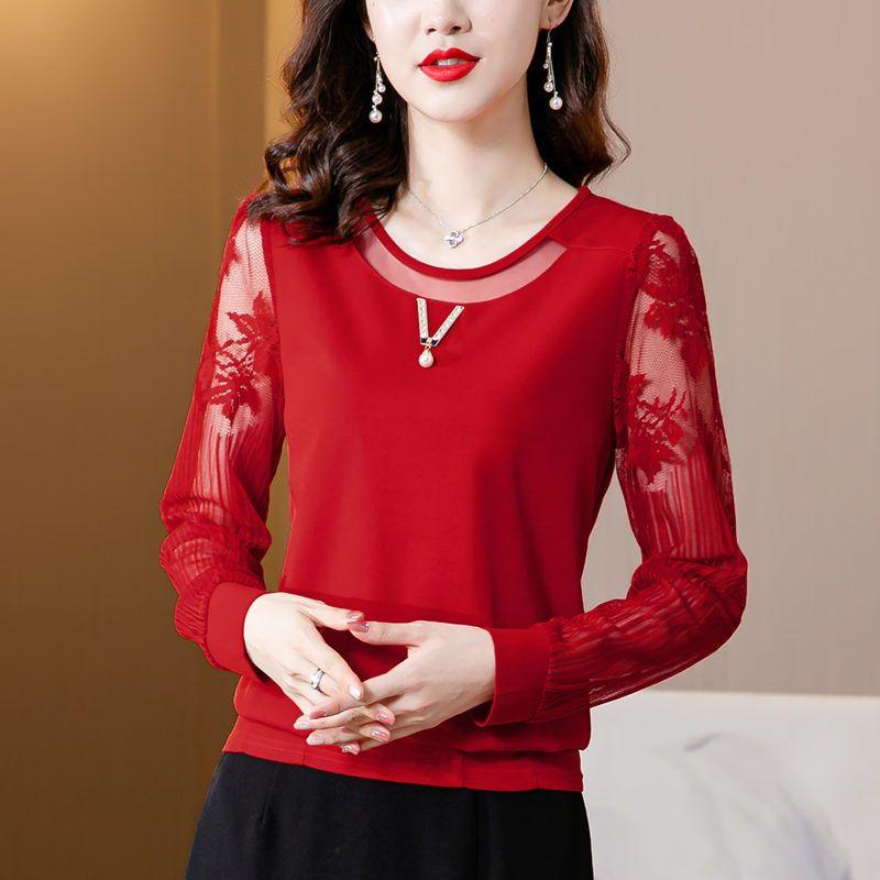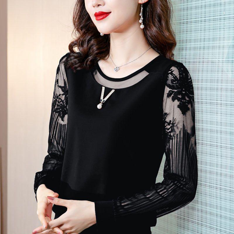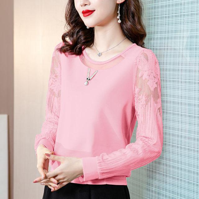 Однотонная кружевная рубашка с круглым воротником, весенне-осенняя одежда, новая женская нижняя рубашка, шифоновый топ, короткая футболка с длинными рукавами