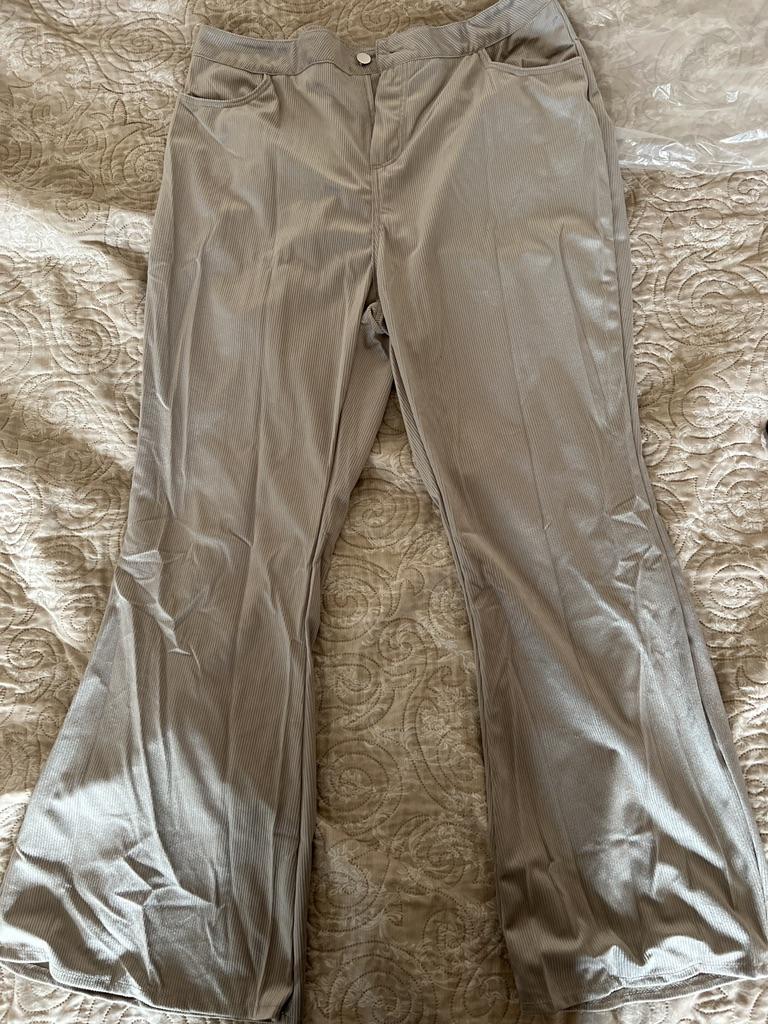 Брюки совсем не зимние, синтетическая ткань в рубчик, вельветом не назовешь. Взяла самый большой размер 3L на свой 54размер, до конца не надела, в бедрах застряла, и к тому же они очень короткие, выше пятки.