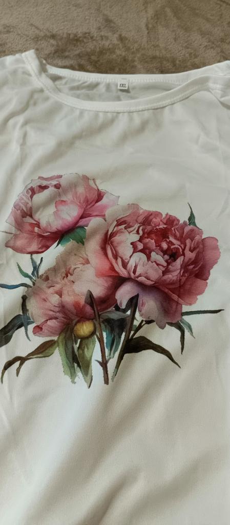 Розовый принт в виде пионов чуть смещен врпаво, но не критично. Для лета такого качества футболки находка. Легкие, приятные к телу, легко стираются, быстро сохнут. Я довольна. Взят размер 5ХL на параметры 108-94-110