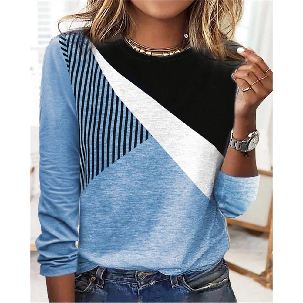 Женская верхняя осенняя футболка контрастного цвета с длинным рукавом и круглым вырезом, свободные футболки