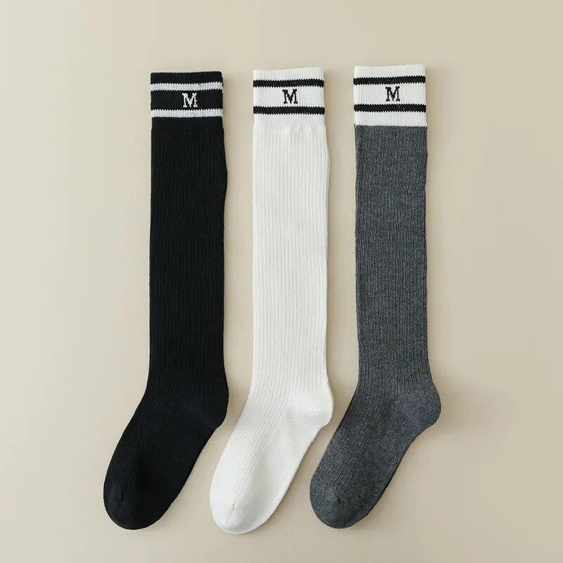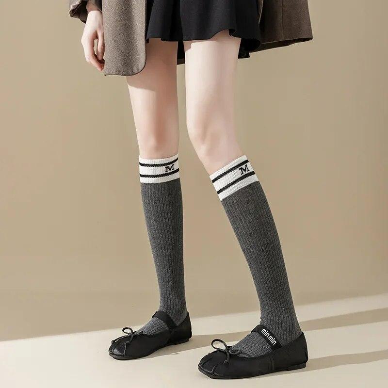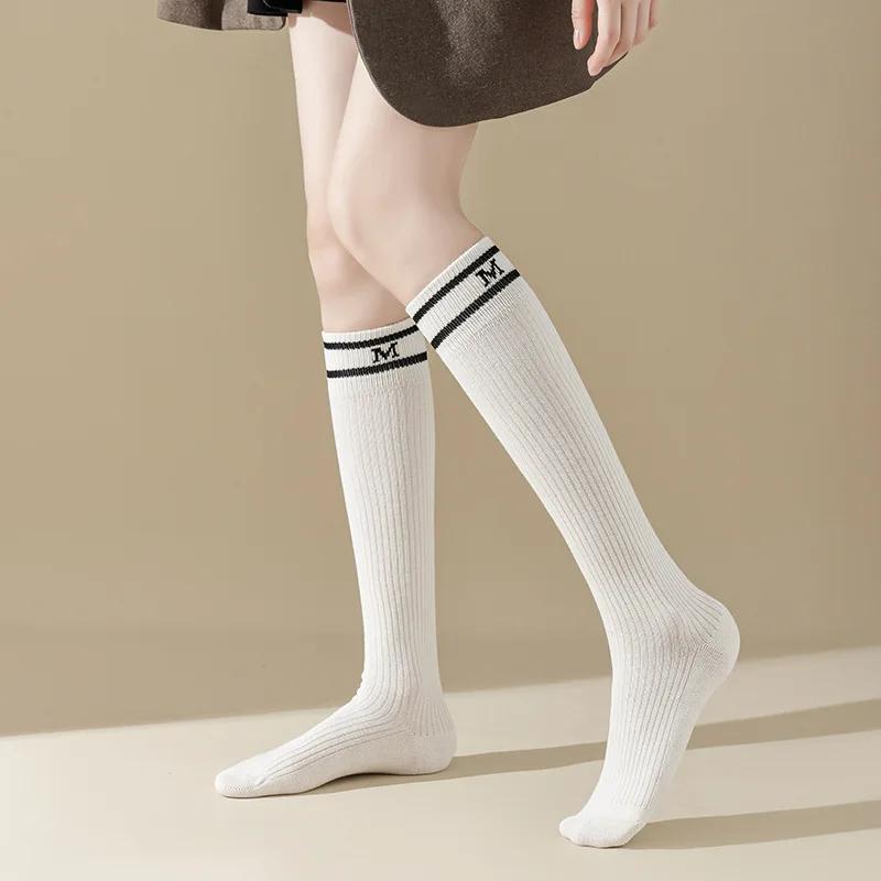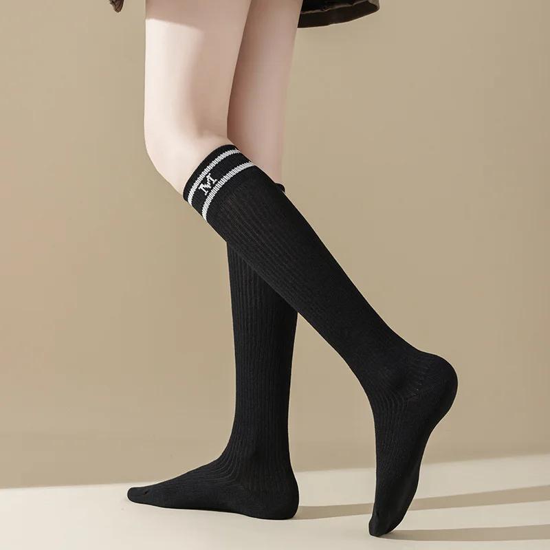 Хлопковые женские чулки в японском стиле, длинные носки для школьниц, чулки с вышивкой букв, однотонные черные, белые, серые гольфы