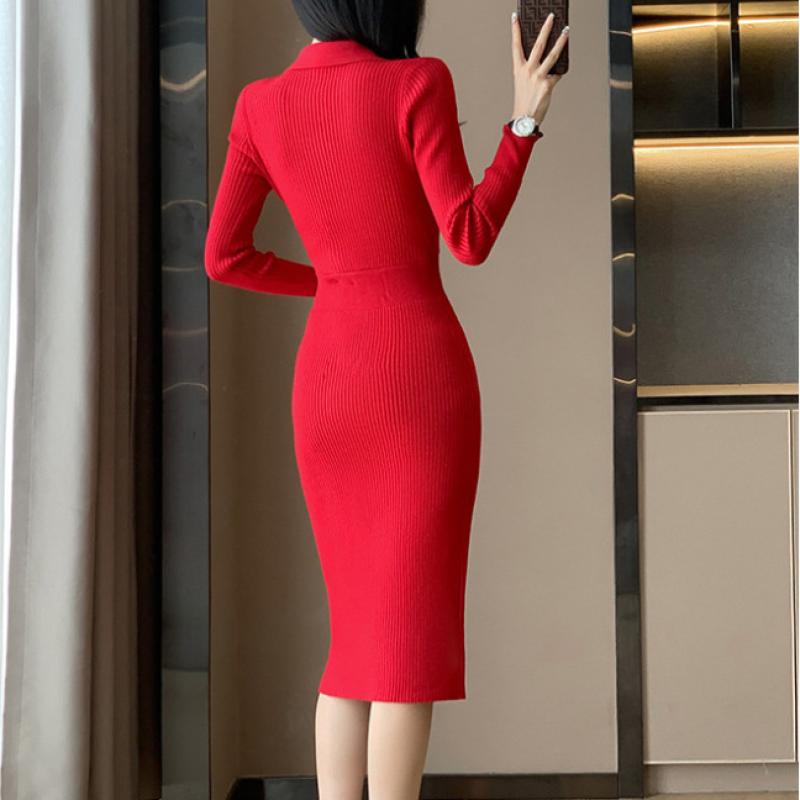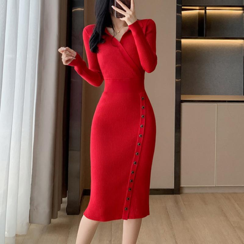 Корейское шикарное новое женское трикотажное платье с v-образным вырезом на осень и зиму, тонкое элегантное повседневное платье с v-образным вырезом и высокой талией