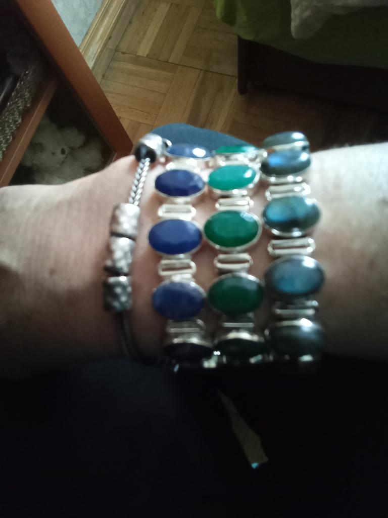 4 синих, остальные зеленоватые. Все с иризацией. Красивый. На 18 отлично. Камни небольшие 14"9,5 мм. Хорошо видна структура камня, прожилки, блеск. Я довольна. Насчет 925- оч большие вопросы) Блестит неестественно. Буду думать как чуть протравить и затемнить "серебро". Выбивает зрительно