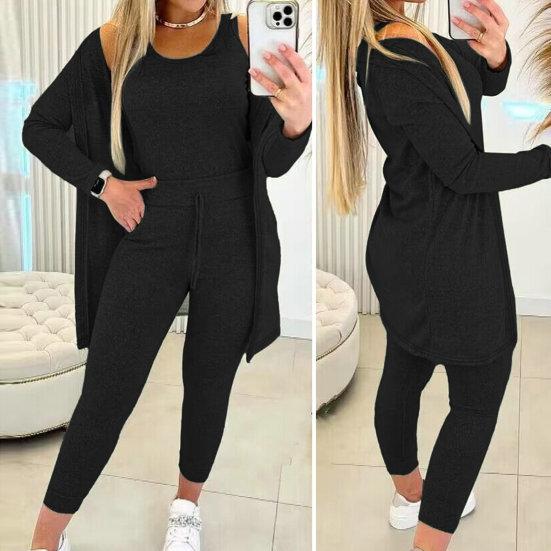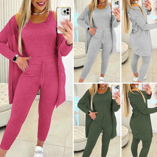 Представляем наш женский повседневный костюм-тройку — идеальный наряд для спортивного и стильного образа.. Изготовлен из приятного для кожи и мягкого полиэфирного волокна, этот комплект слегка эластичен, что обеспечивает удобную посадку.. В комплект костюма входит толстовка с круглым вырезом и длинными рукавами, жилет, длинная куртка и брюки-карандаш узкого кроя с эластичным поясом..