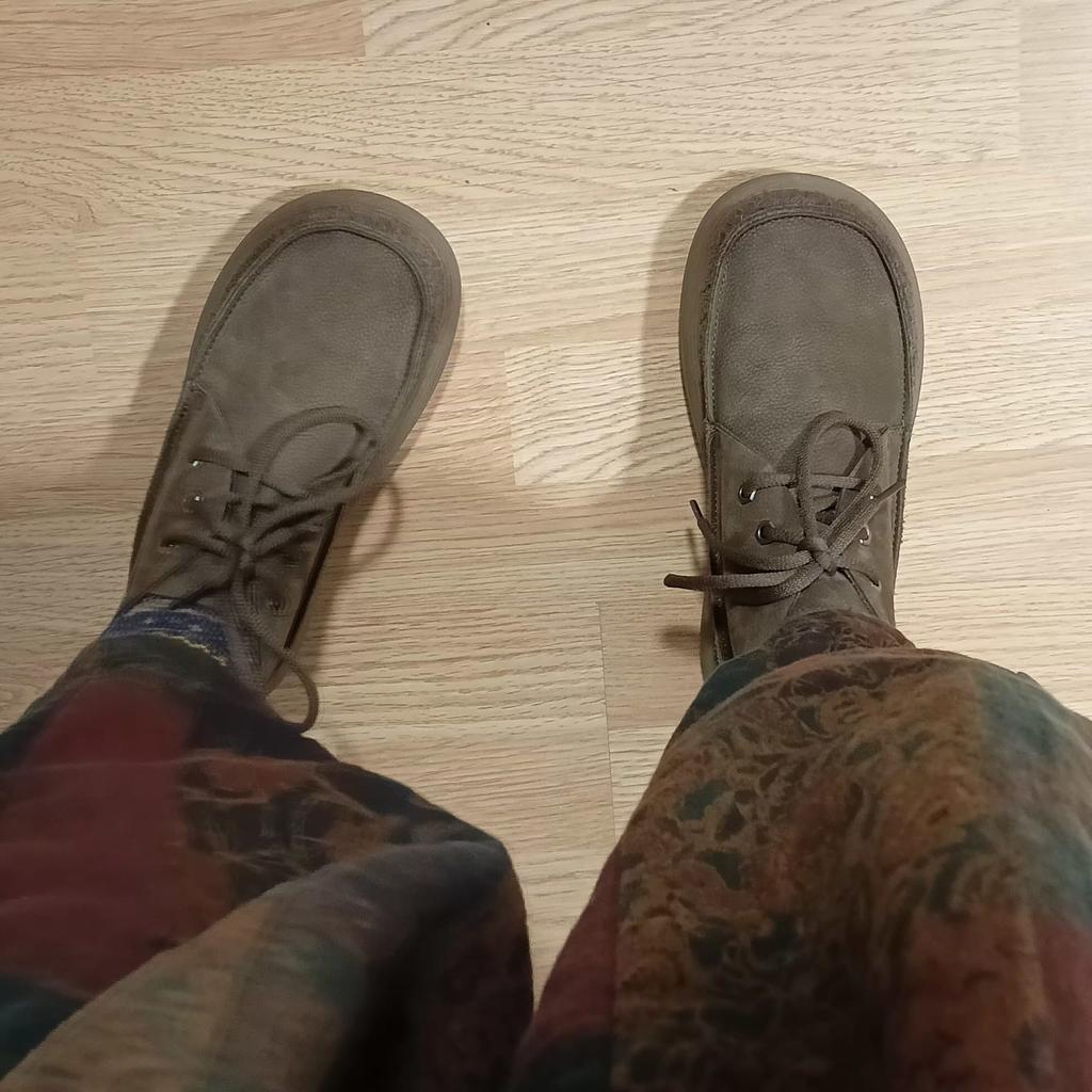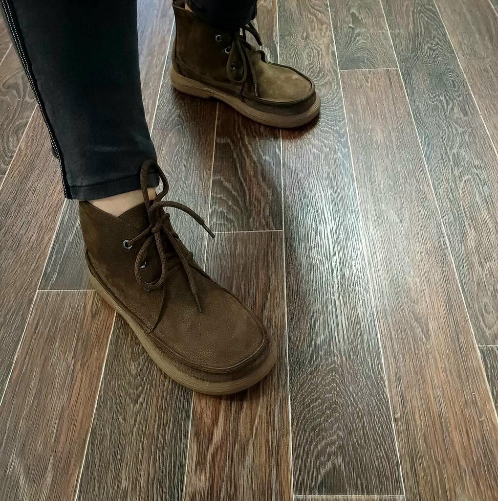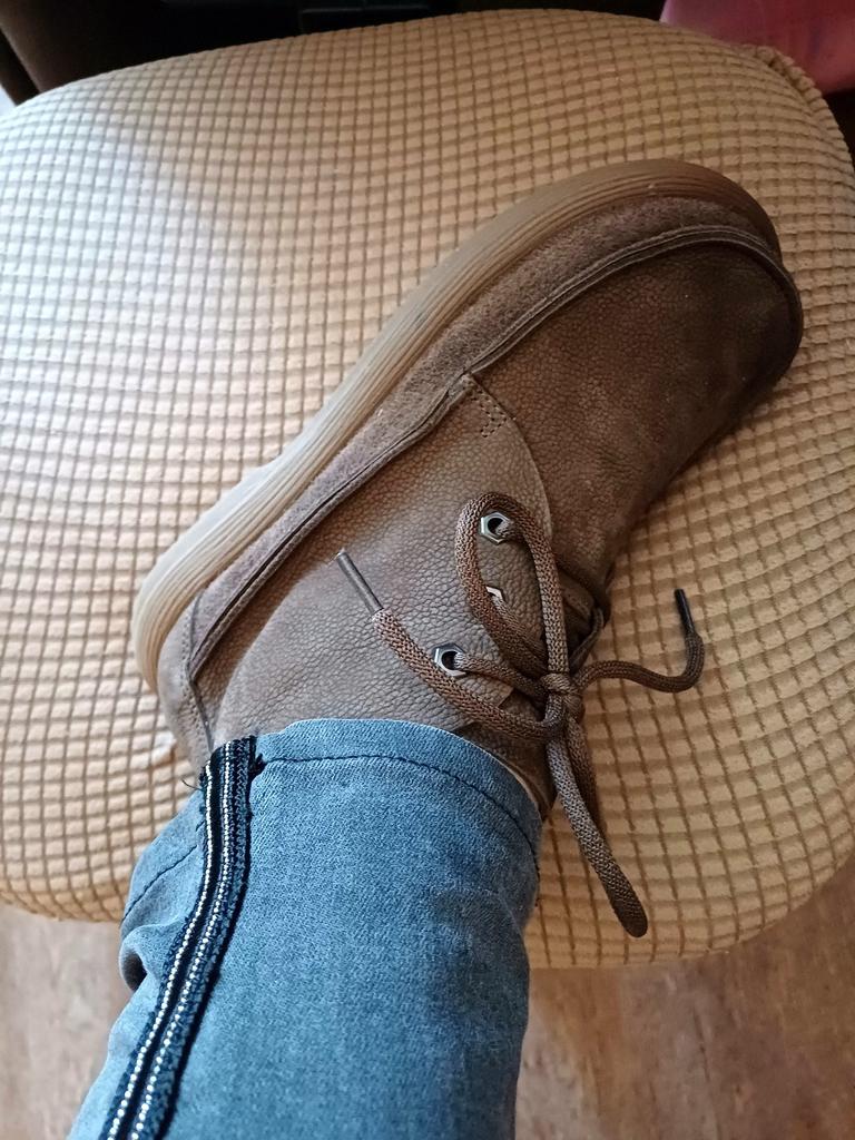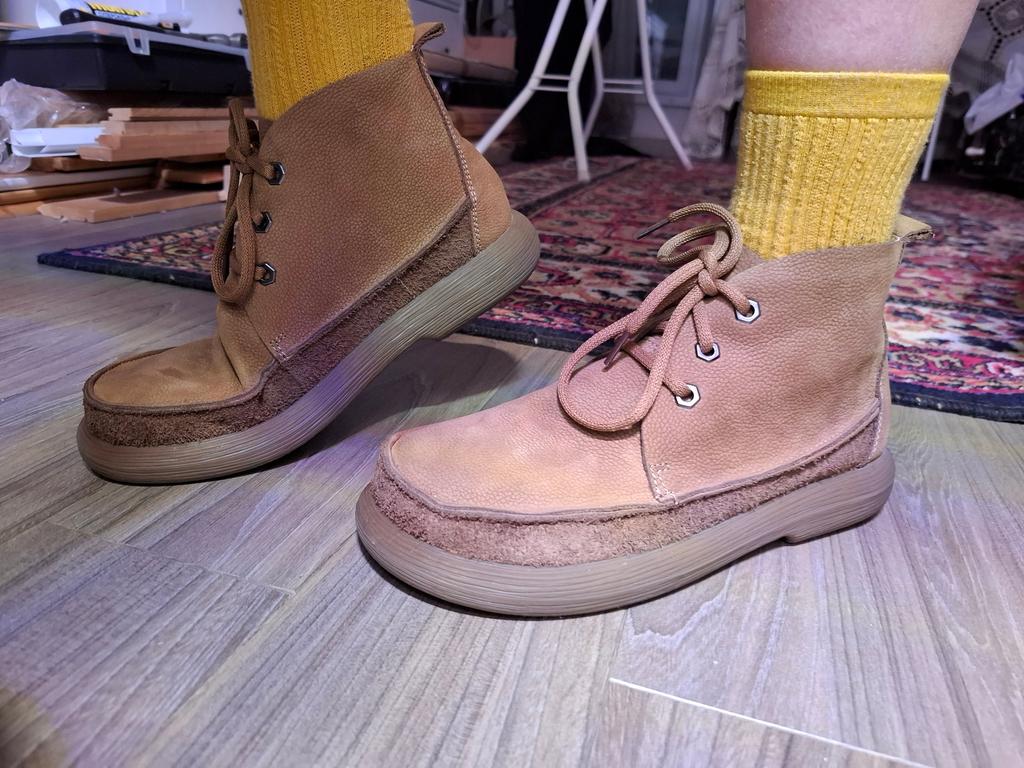 Кожа спилок с нанесённой тиснением фактурой кожаной поверхности. Без подклада. Верхняя часть мыска пролублирована тканой клеевой. Ботинки мягкие. Строчки ровные. Кожаные стельки вклеены. На широкую лапку и небольшой подъём. Конечно, это не премиум обувь, но для каждодневных забегов по делам, да ещё и за такую стоимость - самое то! Думаю, при должном уходе (защита от влаги, просушивание изнутри, чистка кожи от загрязнений) могут прослужить достаточно долго.