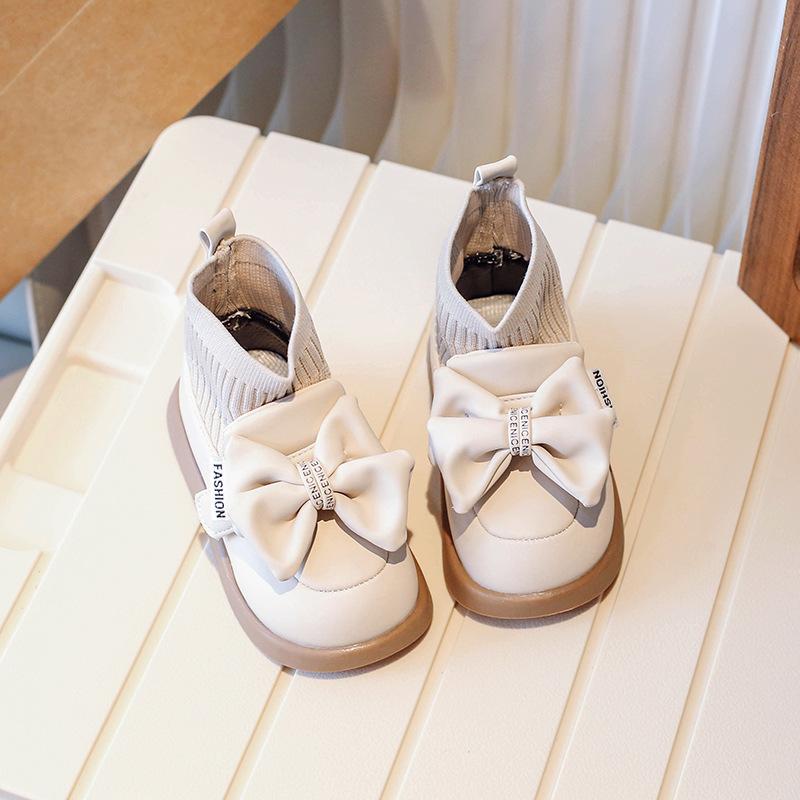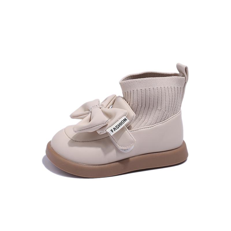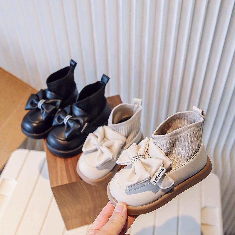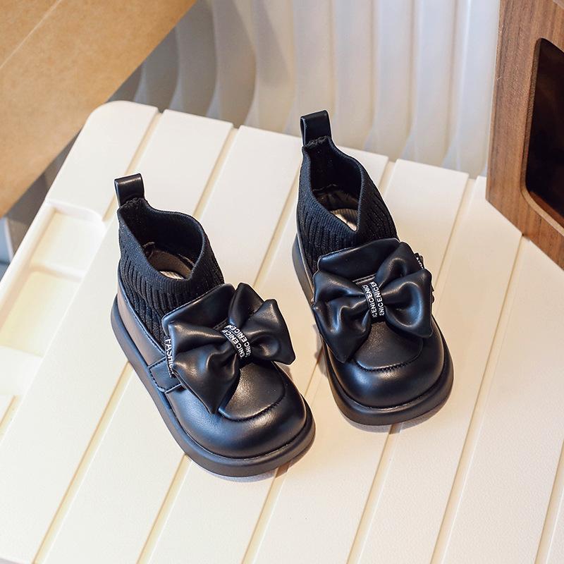 Детские кожаные ботинки с бантом для девочек, носки, эластичные вязаные короткие ботинки, детская обувь для