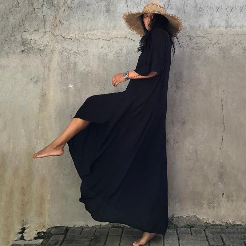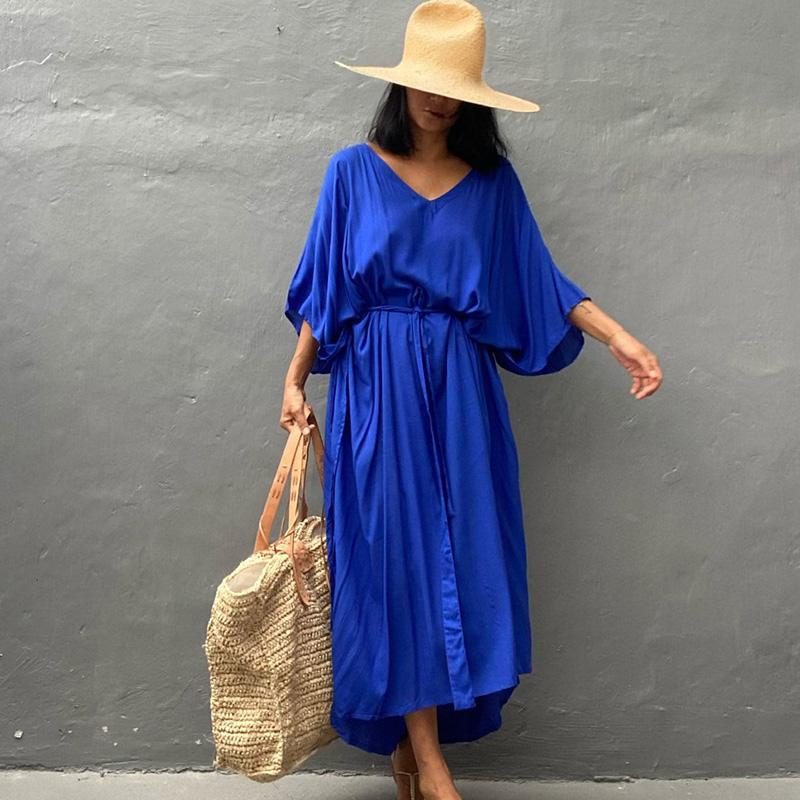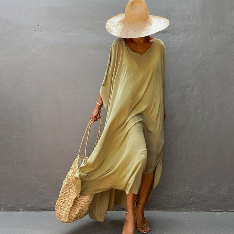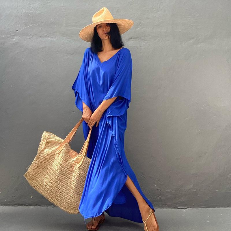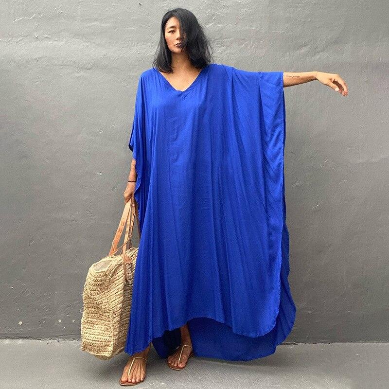 Кафтан пляжное длинное платье женский плюс размер однотонный хлопковый купальник с рукавами «летучая мышь» 2022 накидка на купальный костюм