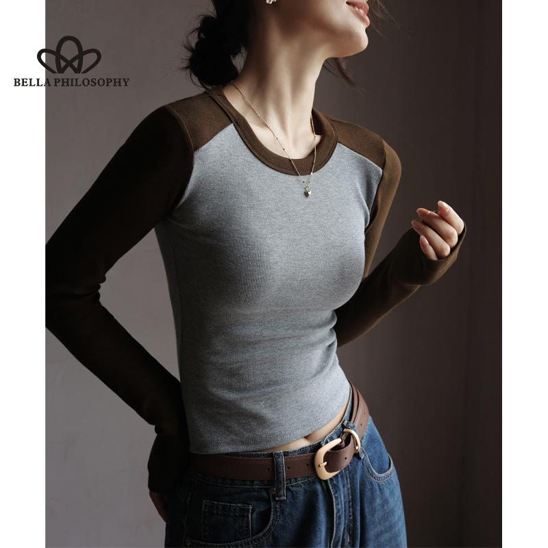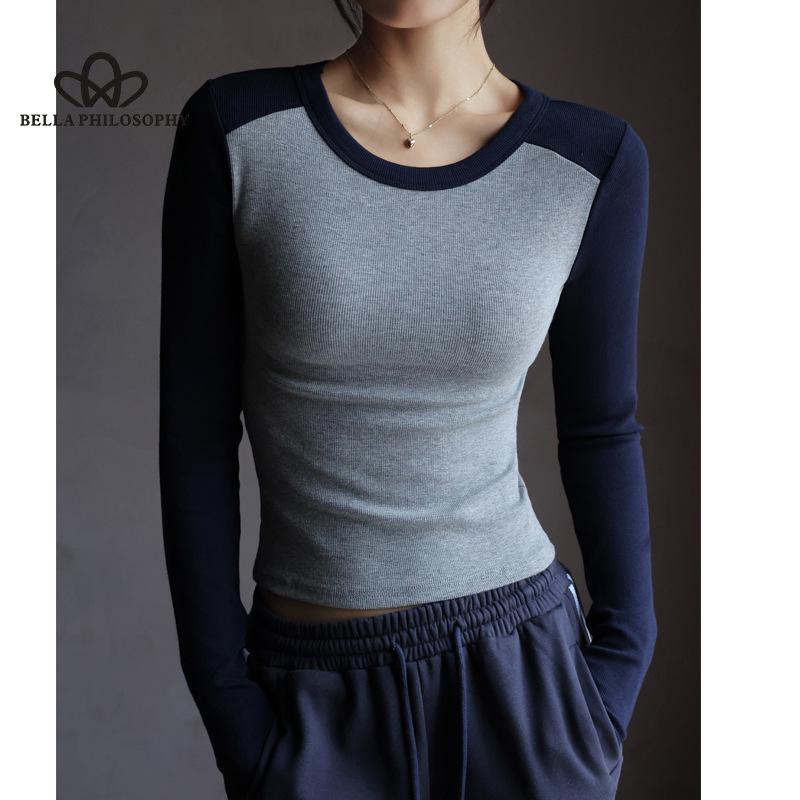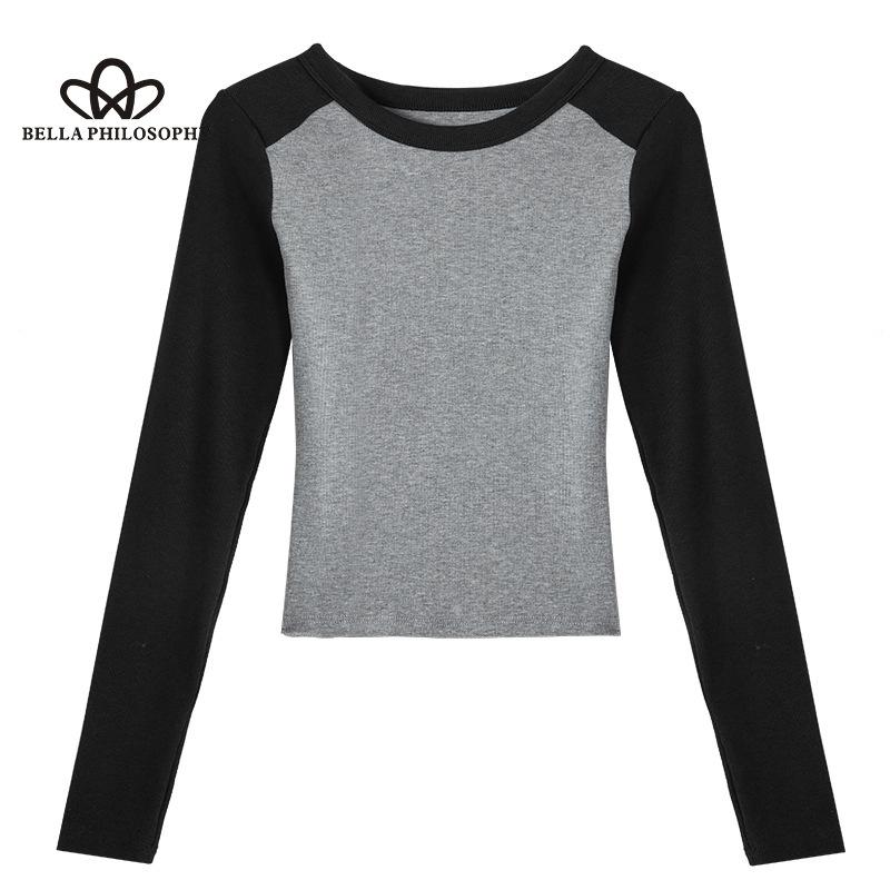 Хлопковая базовая рубашка с круглым вырезом и контрастными рукавами реглан, женская осенняя утягивающая футболка с длинным рукавом, топ