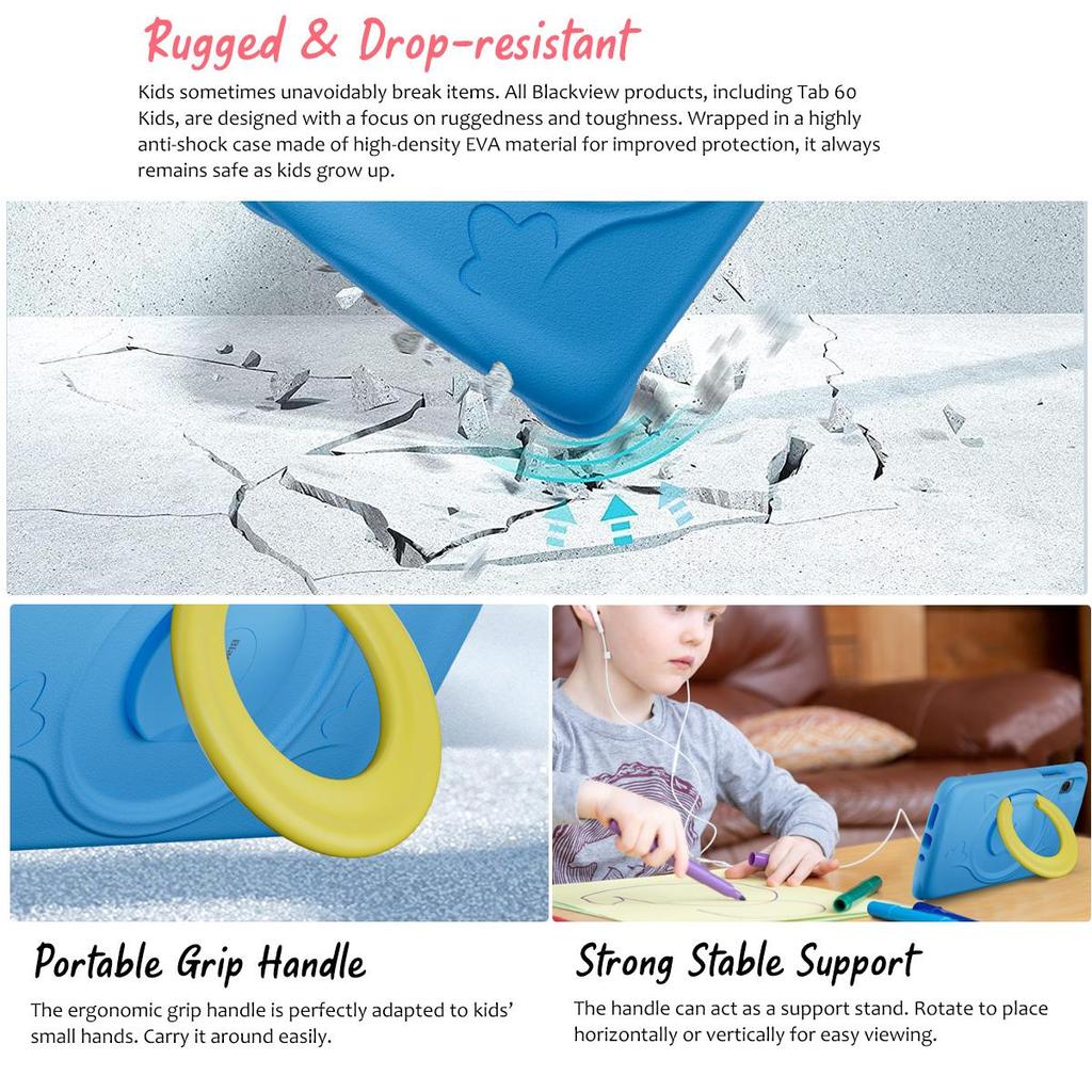 Дети иногда неизбежно ломают предметы. Все продукты Blackview, включая Tab 60 Kids, разработаны с упором на прочность и надежность.. Завернутый в противоударный футляр из материала EVA высокой плотности для улучшенной защиты, он всегда остается в безопасности, пока дети растут.