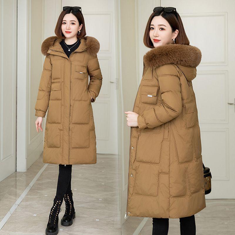 Куртка женская длинная с меховым воротником выше колена, новая зимняя женская тонкая куртка с капюшоном
