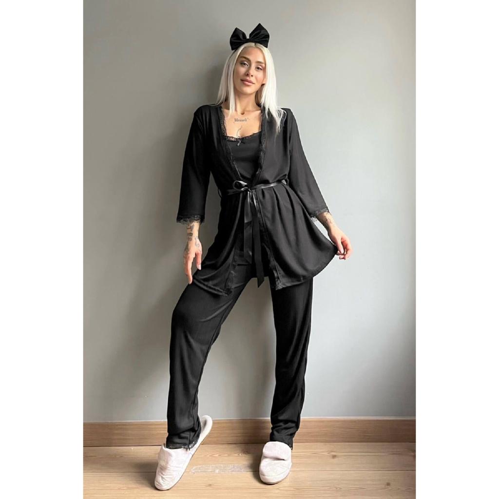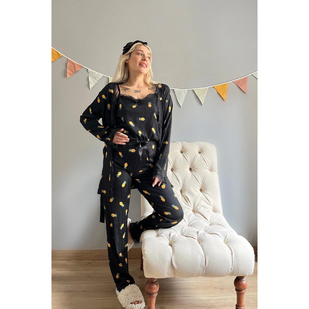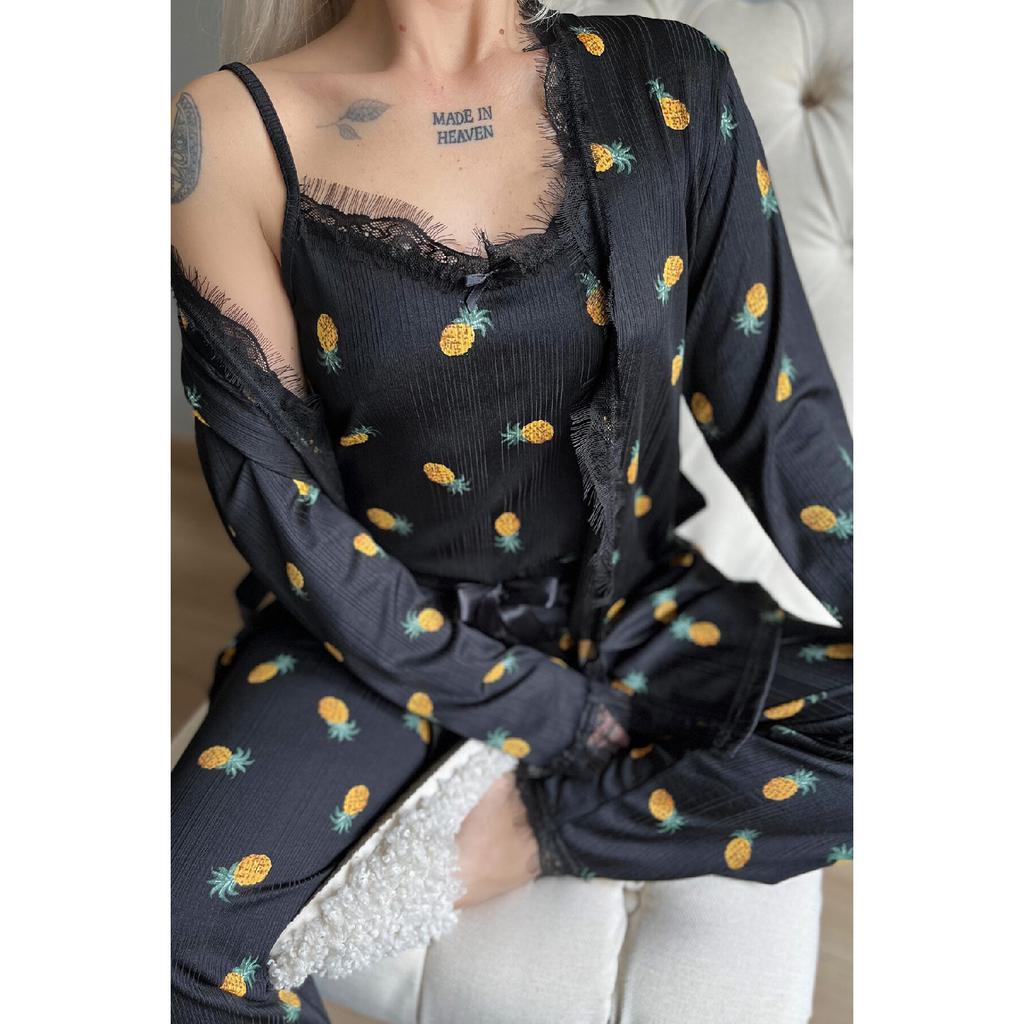 Темно-черный пижамный комплект Pegasus с узором и халатом