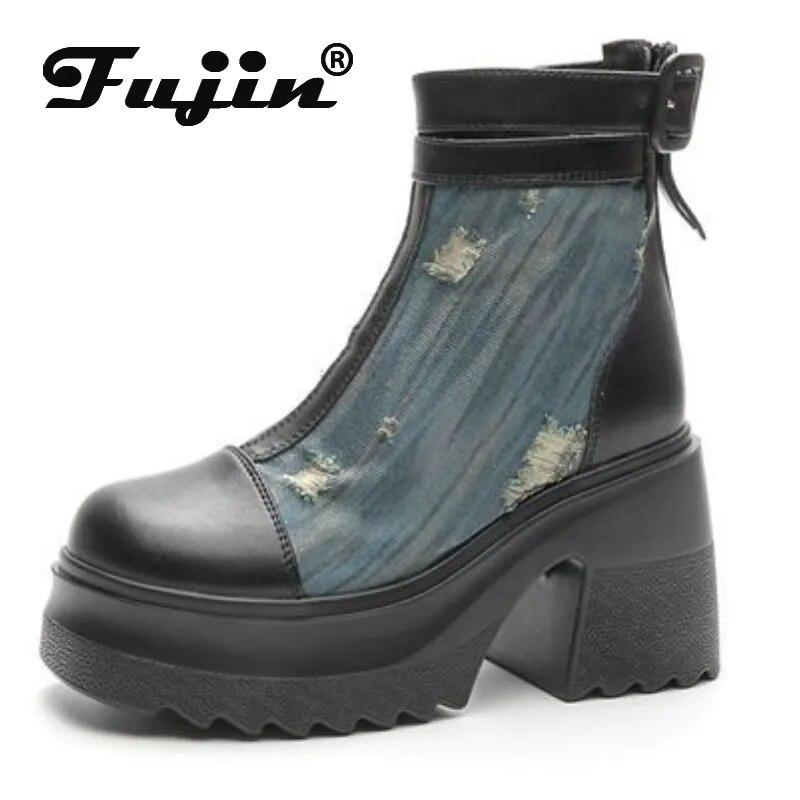 Джинсовые ботинки Fujin из натуральной кожи 10 см, осенне-весенние женские мотоциклетные ботильоны, модная обувь на платформе до середины икры на толстом каблуке