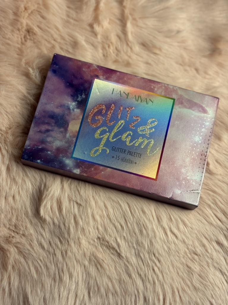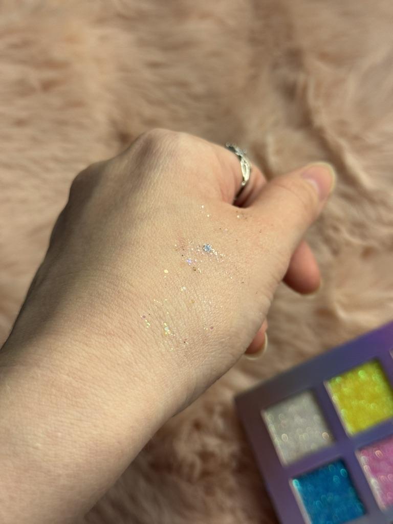 Палетка глиттеров 💐 Очень яркая. Очень клевая. И все бы ничего, но мне пришла она с разбитым зеркалом :( Конечно же, эту часть я просто срезала в итоге, оставила себе только часть с самими тенями. Благо, сами глиттеры вставляются в небольшую коробочку) - Глиттеры самых разнообразных цветов, в палитре целых 15 штук. Подойдут на любой случай, чтобы блистать ✨ Я очень такое люблю! - Наносятся легко. Можно и пальцем вполне себе, можно и при помощи кисти. Блестят красиво под светом ❗️Лучше использовать с базой под тени/блестки, чтобы не опадали, так как они скорее сухие (в основном). - Сами глиттеры, кстати, не пострадали, так как между зеркалом и ними была прозрачная прокладка. К счастью)