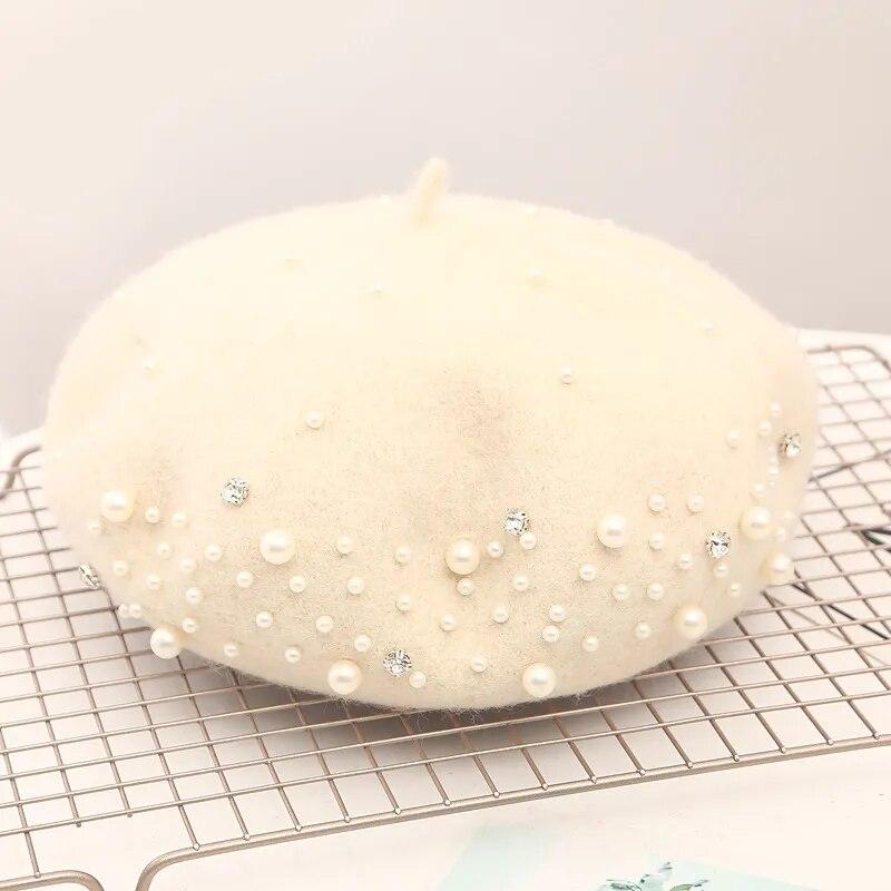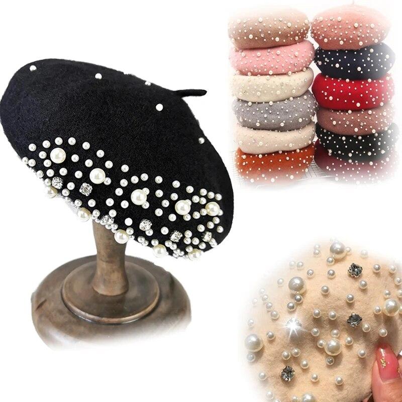 2023 зимний шерстяной берет со стразами и жемчугом, бусины, женская элегантная кепка, осенне-весенняя шапка, женская однотонная кепка во французском стиле
