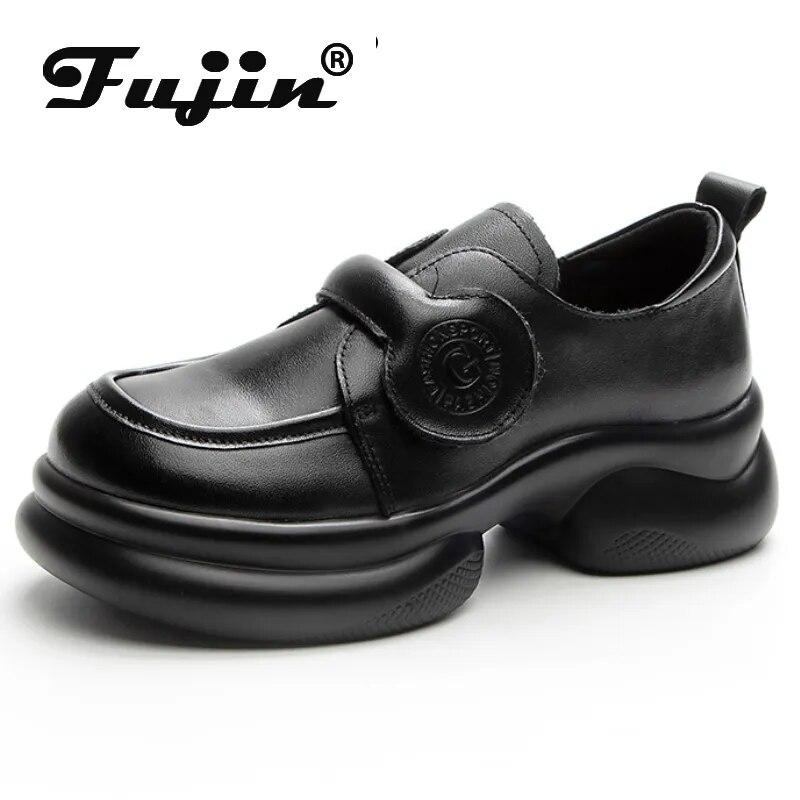 Fujin 6 см из натуральной кожи в стиле ретро в этническом стиле с неглубоким верхом Мэри Джейн, роскошные новые туфли из коровьей кожи, женские летние туфли на танкетке с круглым носком, женские туфли с крючком
