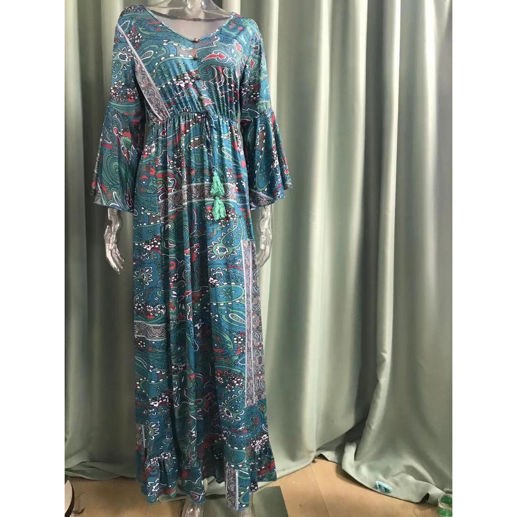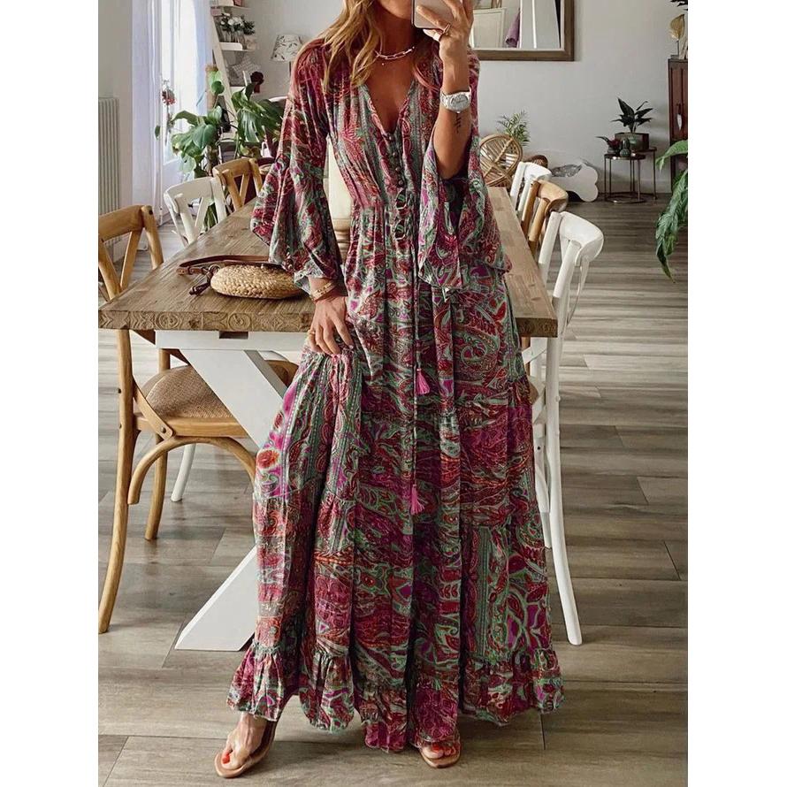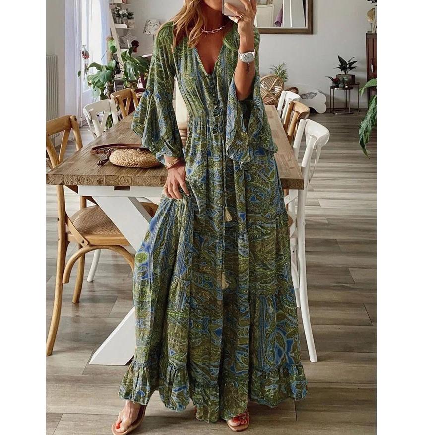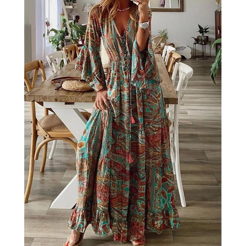 Богемное летнее осеннее женское длинное платье с рюшами и подолом, цветочный принт, V-образный вырез, свободные макси-платья с расклешенными рукавами