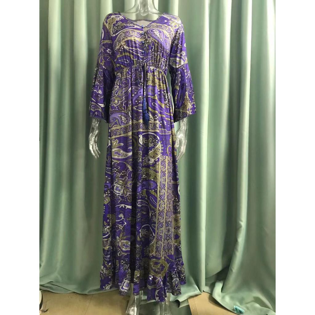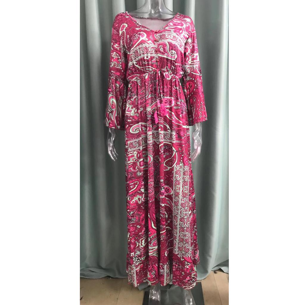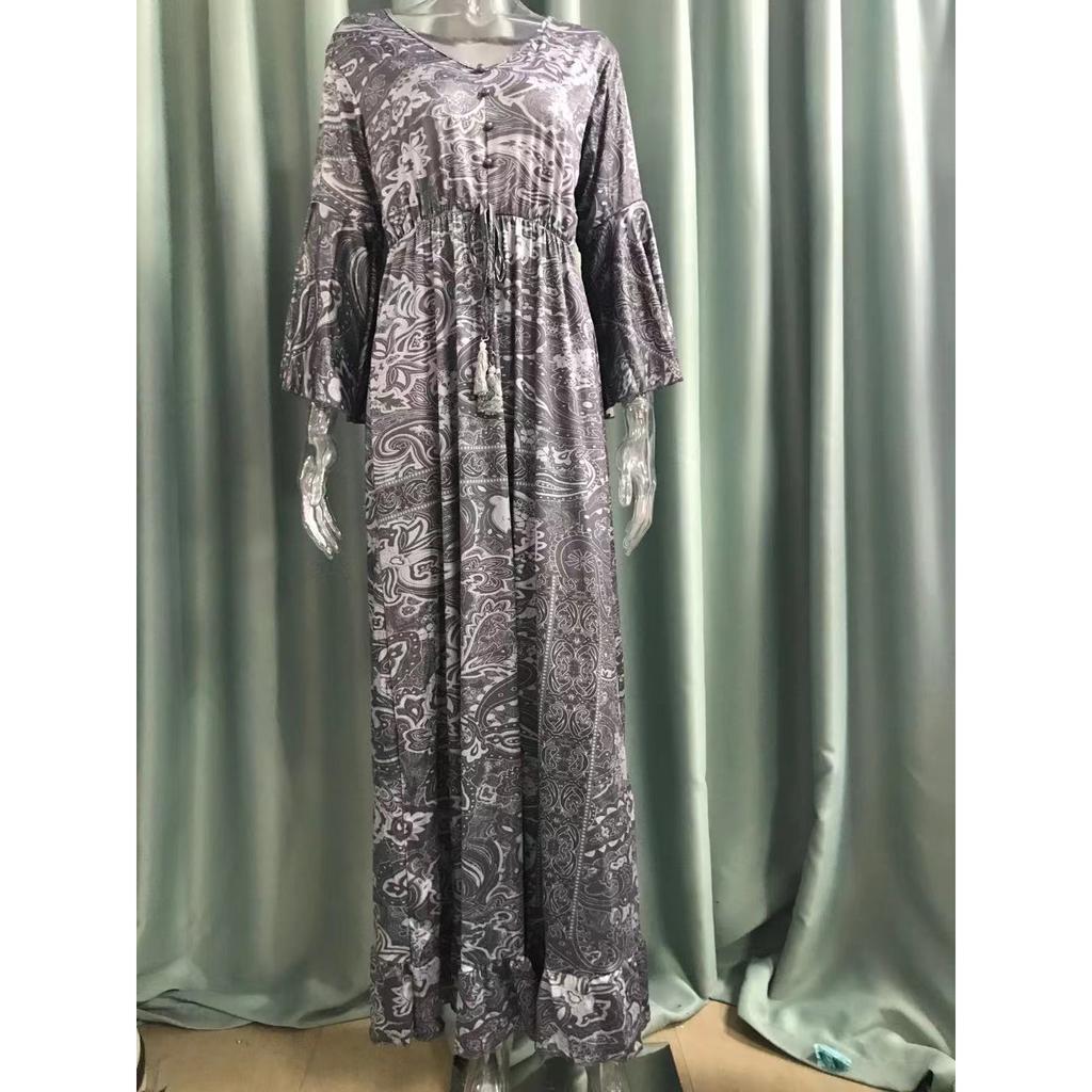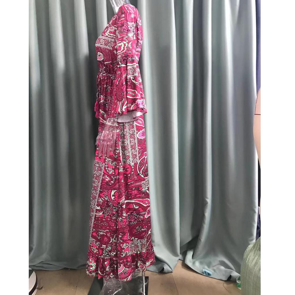 Богемное летнее осеннее женское длинное платье с рюшами и подолом, цветочный принт, V-образный вырез, свободные макси-платья с расклешенными рукавами