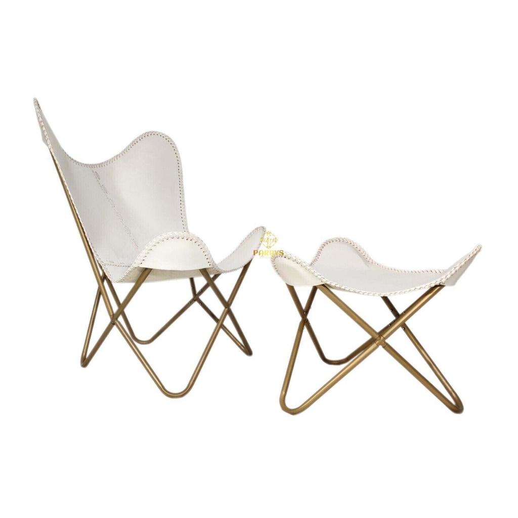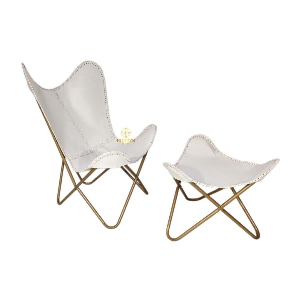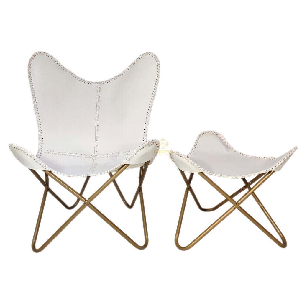 Белый шезлонг/табурет-кресло-бабочка из кожи ручной работы с оттоманкой