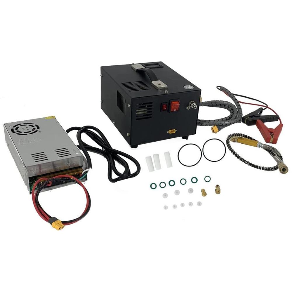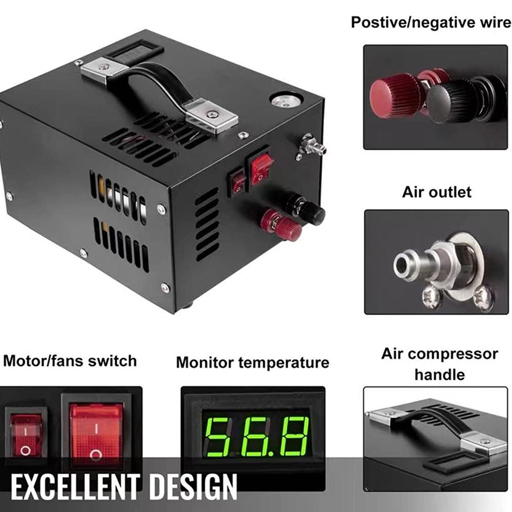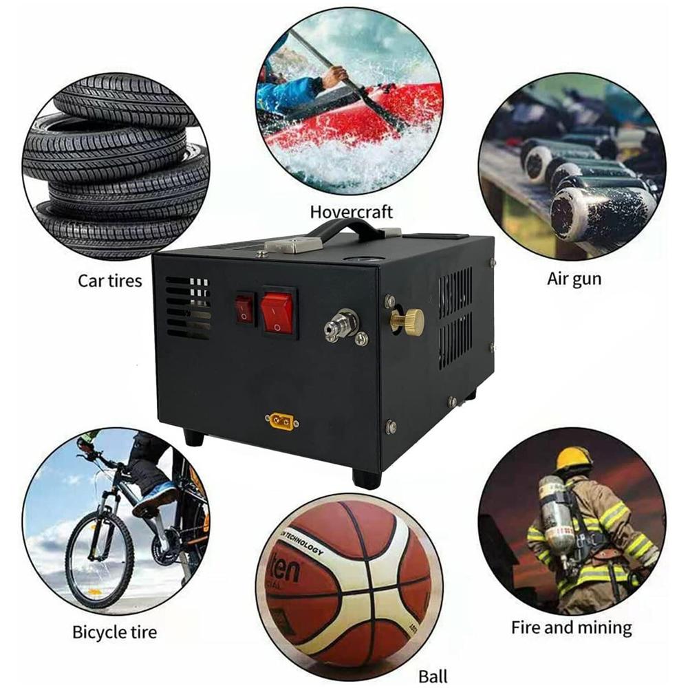 Это портативный воздушный компрессор, легкий вес, небольшой размер, удобный для переноски, рабочее давление 300 бар, 4500 фунтов на квадратный дюйм, 30 МПа, не содержит масла и воды, встроенная система охлаждения и слива вентилятора.. Он может питаться от силового кабеля напряжением 110 В и 220 В с трансформатором или от автомобильного силового кабеля.