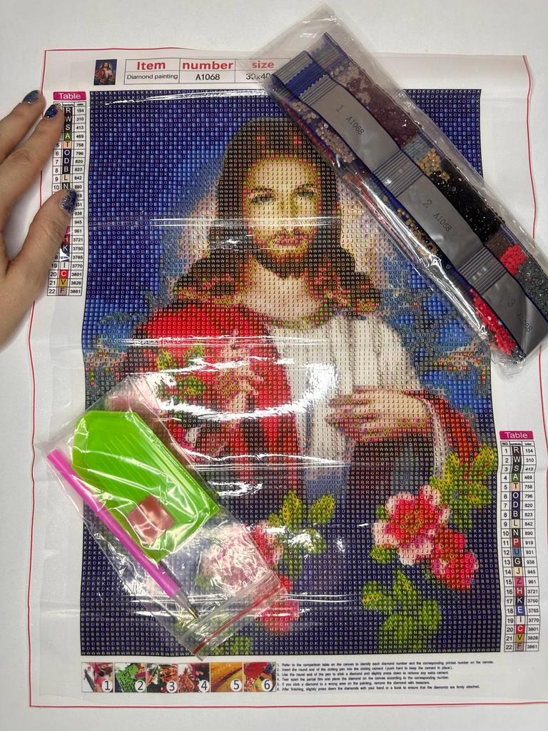 🤗ВСЕМ ПРИВЕТ.🙌 Заказ шёл месяц в сборной посылке. В заказе Алмазная мозайка Иисус . Размер 40 × 30 см. Сборка алмазной картины совершенно несложная а очень даже увлекательная. Стразы по нумерации цвета выкладываются на липкий слой под плёнкой точно указанному номеру маркировки пакетиков. Вот таким образом и заполняется весь рисунок картины. Здесь главное -усидчивость, желание и свободное время. Собраную картину в обрамлёмном виде не стыдно подарить и на подарок. А подарок сделанный своими руками вдвойне приятно получить от близкого человека. Для меня сборка картин из страз это хобби в морозные долгие вечера. А мелкая моторика для рук нужна не только для детей но и полезна в нашем возрасте кому за......... . Приходит комплект для мозайки скрученый валиком на стразы, заломов нет. В комплект входит : Картина с липким слоем под плёнкой. Набор разноцветных страз, (круглые) Стилус. Лоток для страз. Сухой клей. Покупкой довольна Продавца и товар рекомендую. ВСЕМ УДАЧНЫХ ПОКУПОК.👍🤗👏