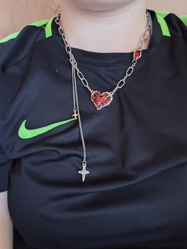Классное! Полностью соответствует промофото, аккуратное, красивое. Верхнее украшение - прозрачный красный камешек, центральное металлическое сердечко залито красной эмалью, тонкие цепочки-подвески можно наматывать на основную цепь как нравится. Длина с удлинителем 50 см. Бижутерия недорогая, но мне очень понравилась! 👍🔥