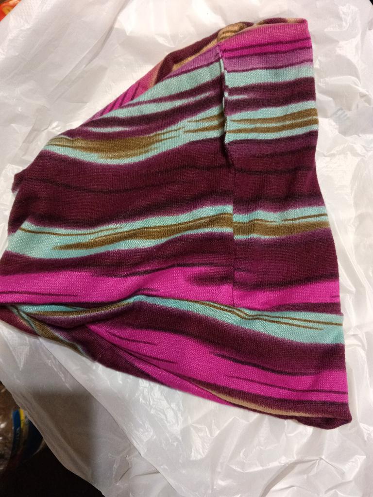В принципе, за эти деньги- огонь. Тоненький трикотаж. Если кто помнит, в 90-х были китайские джемпера в розочку, так вот трикотаж именно такой... Мягкая, хорошо тянется, два слоя. Как видно на фото, одна сторона- более коричневая, другая- более фиолетовая. Меня устраивает, что она нежаркая, для межсезонья, для тех, кто испытывает проблемы с потливостью. Сделана чулком, можно носить, как шарф. По доставке непривычно долго, больше месяца