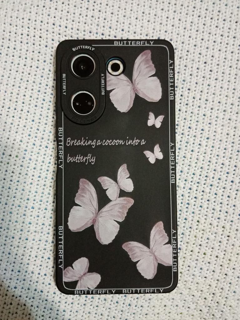Чехол отлично сидит на телефоне, не спадает. Только на картинке бабочки ярче, чем в жизни