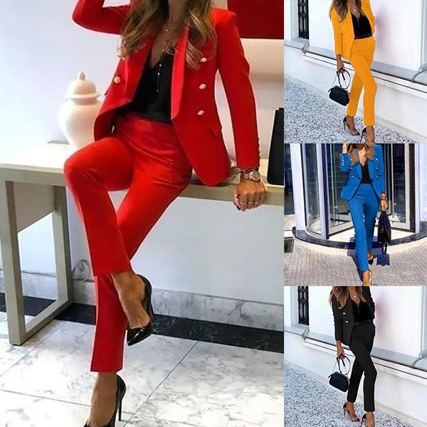 Поступление, женские модные повседневные костюмы из двух предметов, комплект из блейзера и брюк, офисная женская одежда, однотонный цвет