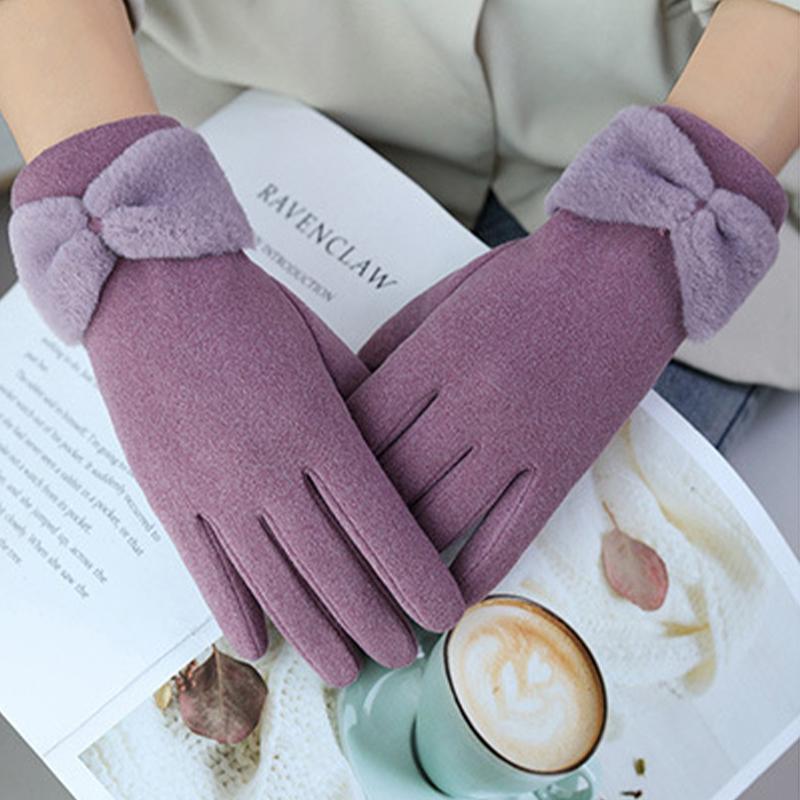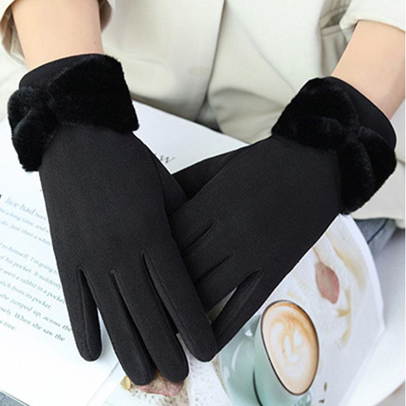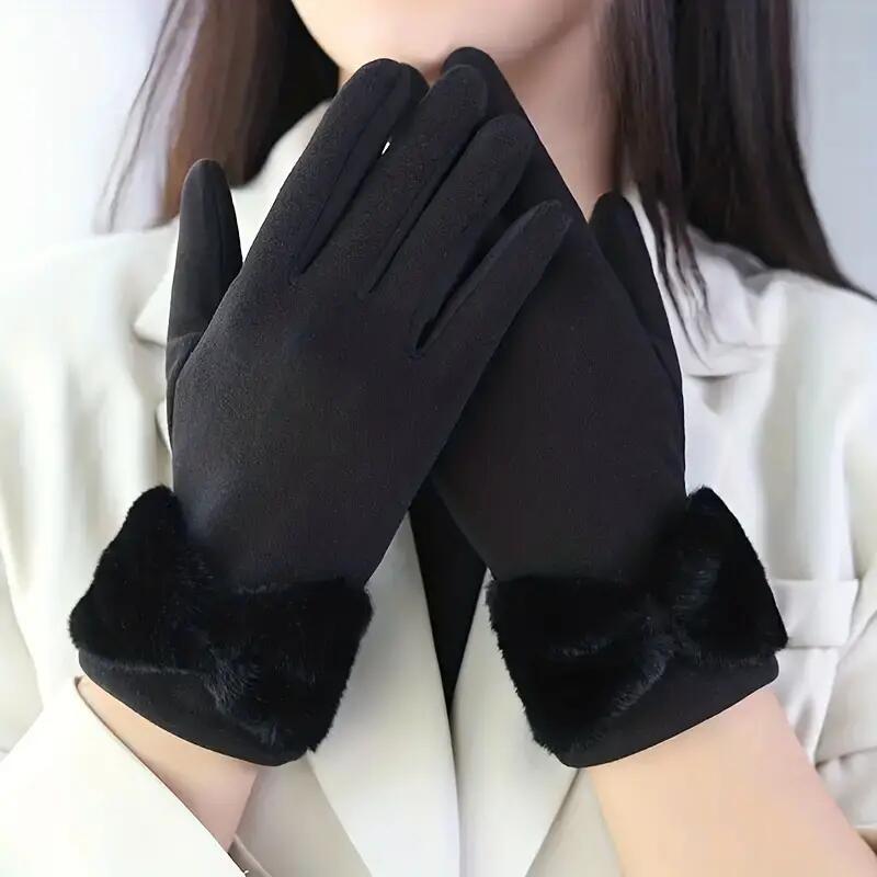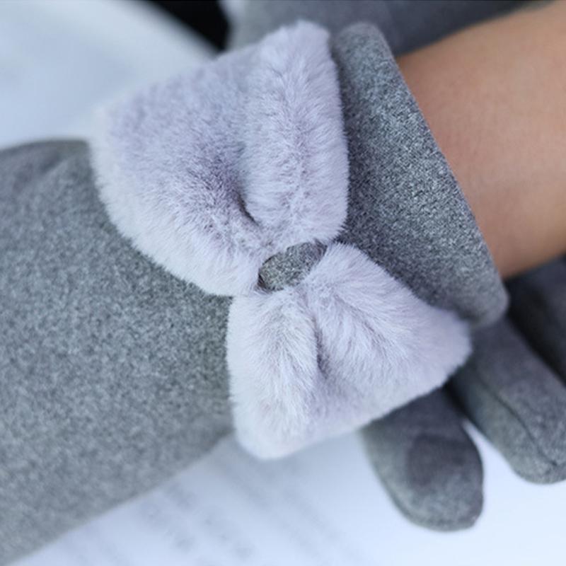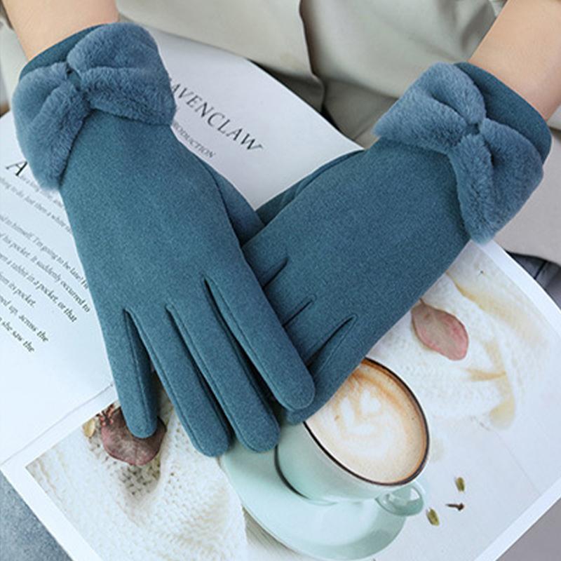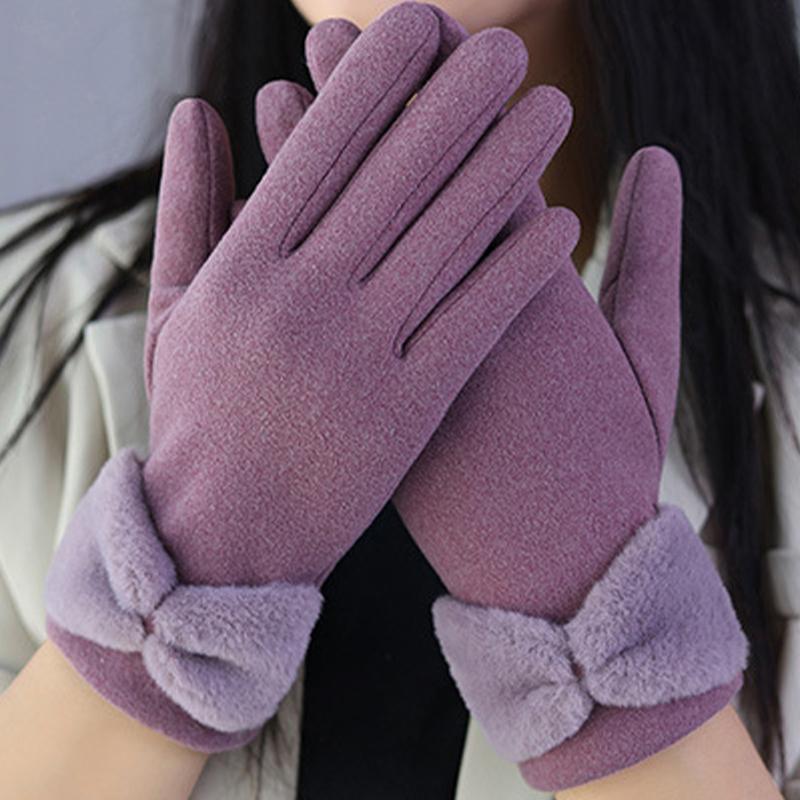 Сплошные зимние теплые перчатки, элегантные плюшевые женские перчатки с бантом и манжетами, стильные повседневные ветрозащитные перчатки