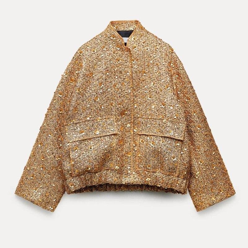 Блестящая куртка с воротником-стойкой и блестками для женщин 2023, осень-зима, с длинным рукавом, золотого цвета, повседневное свободное женское пальто, шикарное карманное модное уличное пальто, винтажное пальто