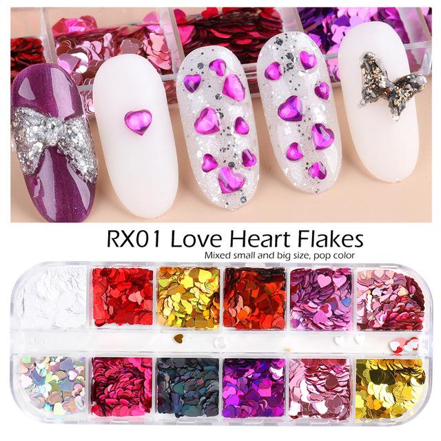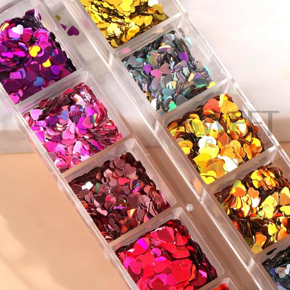 12 сеток, блестящие блестки для ногтей в форме сердца, голографические чешуйки для ногтей, блестящие лазерные блестки для дизайна ногтей, украшение для ногтей своими руками
