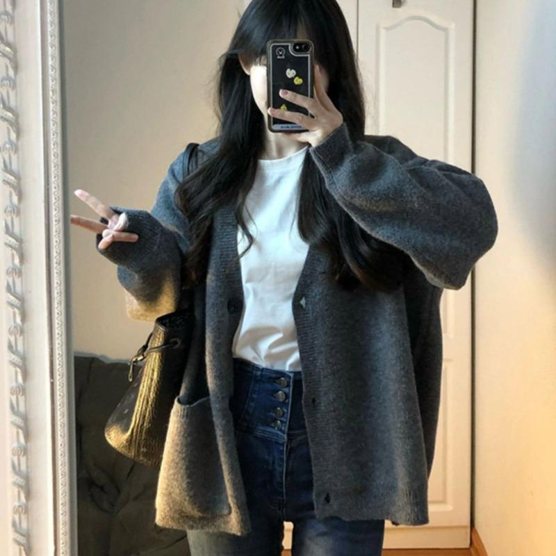 Серый свитер, кардиган, пальто, женский осенне-зимний однотонный свободный верх с длинными рукавами, вязаный кардиган, свитер, женский топ