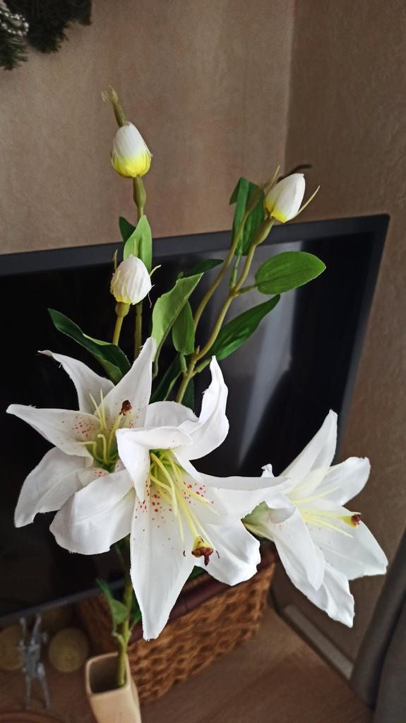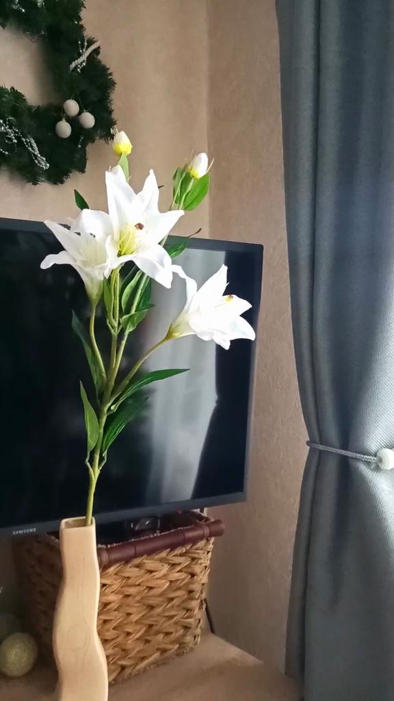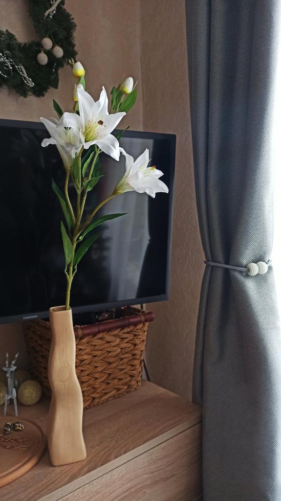 Цветы среди зимы... Нежная белая лилия из магазина Bluelans flower decoracion Цветок из искусственных материалов (пластик, текстиль с пропиткой), очень подобен настоящей живой лилии. Выполнен чудесно! Впереди подробное, детальное видео ➡️ 📽️ Веточка имеет три бутона и три полноценных, распустившихся цветка, крепкий стебель и много зелёных листьев. Высота по моим замерам 77 см, включая верхние бутоны. Цвет белый. Качество хорошее, при рассмотрении очень качественное исполнение. При распаковке был немного примят, быстро рассправила даже без отпаривания. Для такого вида искусственных соцветий, очень даже достойный вариант. Подходит для декора интерьера. Спасибо продавцу, цветочек меня приятно удивил 👍 Вам только приятных покупок. И спамибо за ваши ❤️