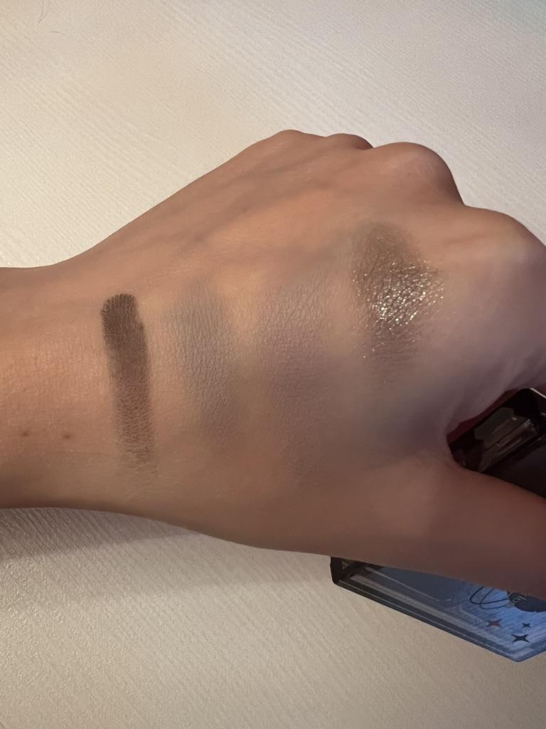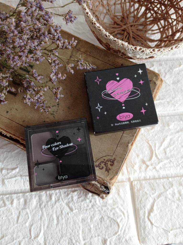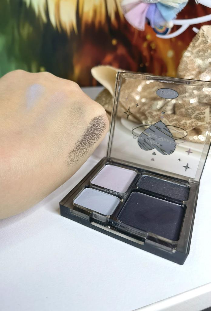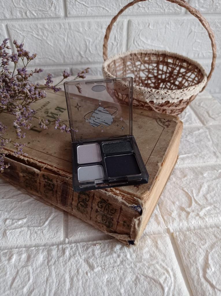Палетка теней в 4 цветах Тени подходят как для вечернего, так и повседневного макияжа 3 цвета матовые, один с мелкими блёстками Тени легко ложатся, растушовываются между собой, водонепроницаемые. Цвета яркие, мне понравилось, что они могут быть как нежнее, так и интенсивное, в зависимости от нанесения. Держатся хорошо. Срок годности до 2027 г., указан как на коробочке, так и на самой палетке.