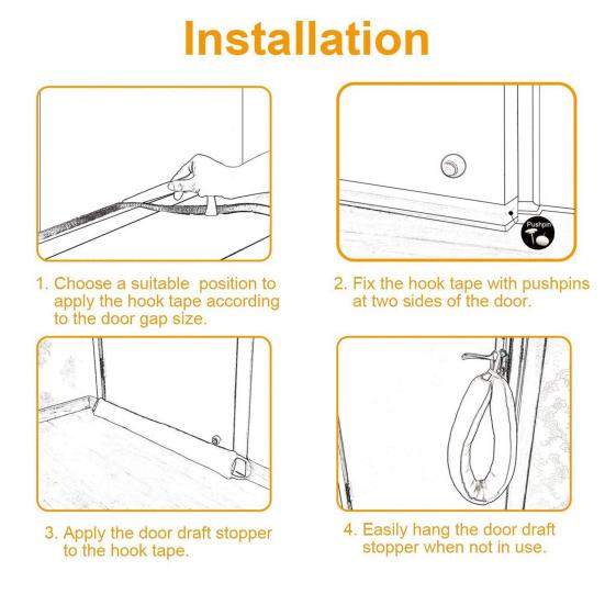Установить воздушный ограничитель двери очень просто.. Просто прикрепите его прямо к нижней части двери и наслаждайтесь уменьшенным потоком воздуха и странными шумами.. Он универсален и подходит для использования на входных дверях, задних дверях, внутренних дверях, наружных дверях, штормовых дверях, патио, спальнях, кухнях или под окнами.