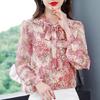 Шифоновая рубашка с цветочным принтом, женская весна/лето, новая корейская блузка с воротником-шарфом и бантом, модная свободная блузка с длинными рукавами