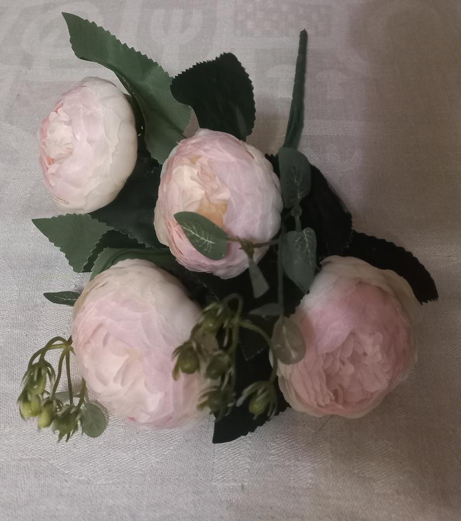 Больше похожи на пионы, высота около 33 см, на ножке 5 цветков и три нераскрытых бутона, 10 очень маленьких зеленых бутончиков. Одна ветка- это целый букетик, очень нежные.