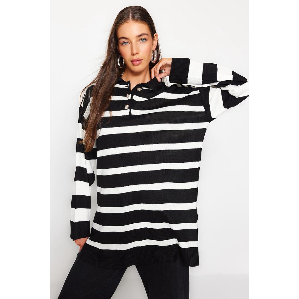 Черно-белый полосатый трикотажный свитер с воротником-поло Tctaw24ak00045