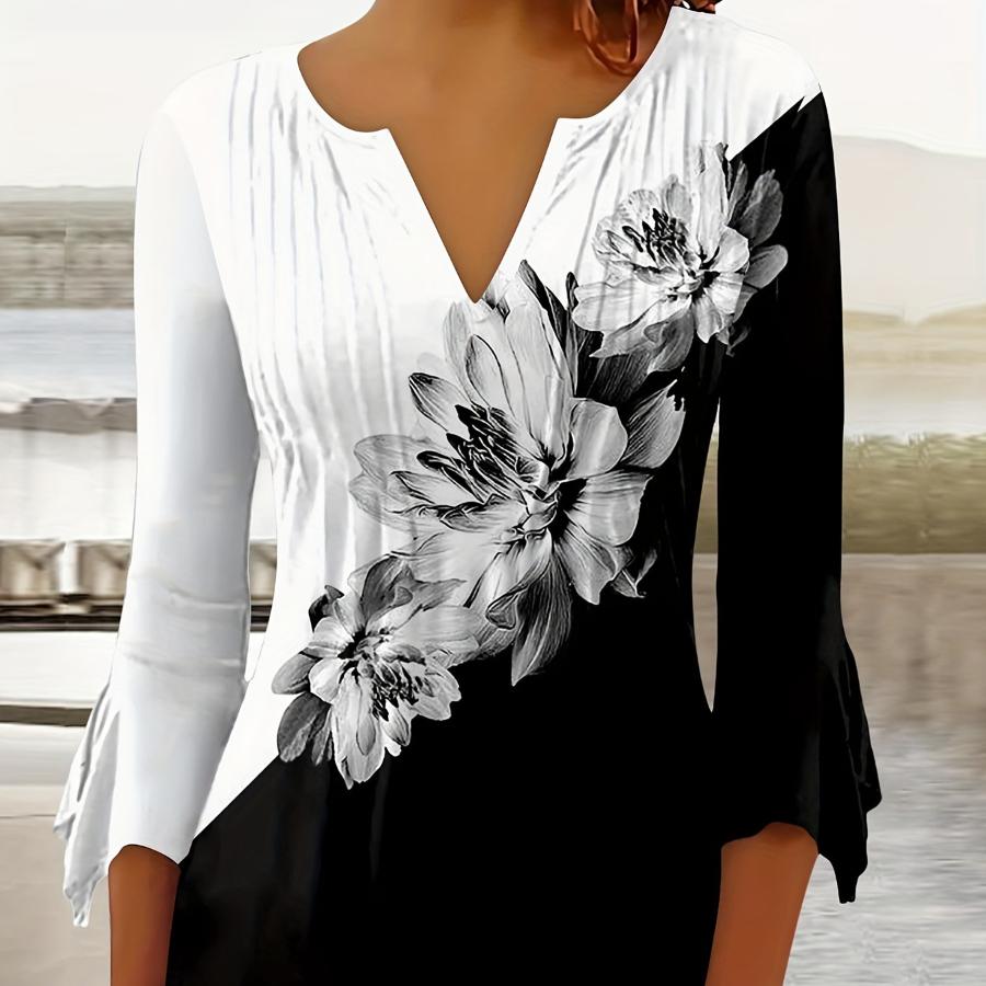 Лето-Осенняя тонкая черно-белая футболка с цветочным принтом, женские свободные элегантные топы с длинными рукавами и принтом, женская одежда