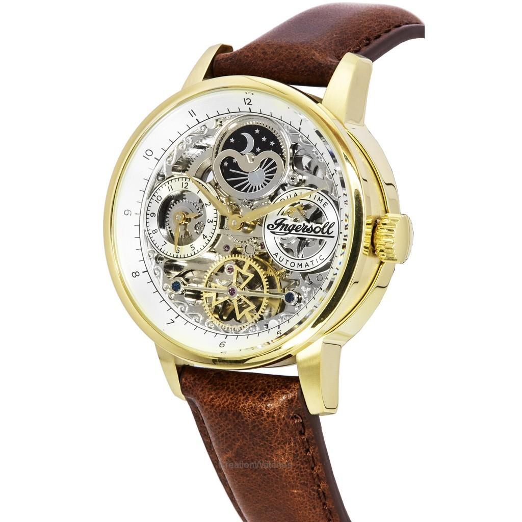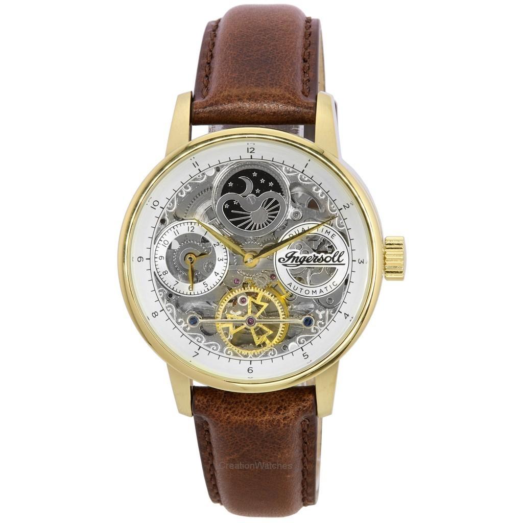 Ingersoll Jazz Moon Phase кожаный ремешок скелетонированный золотой циферблат автоматические мужские часы I07704