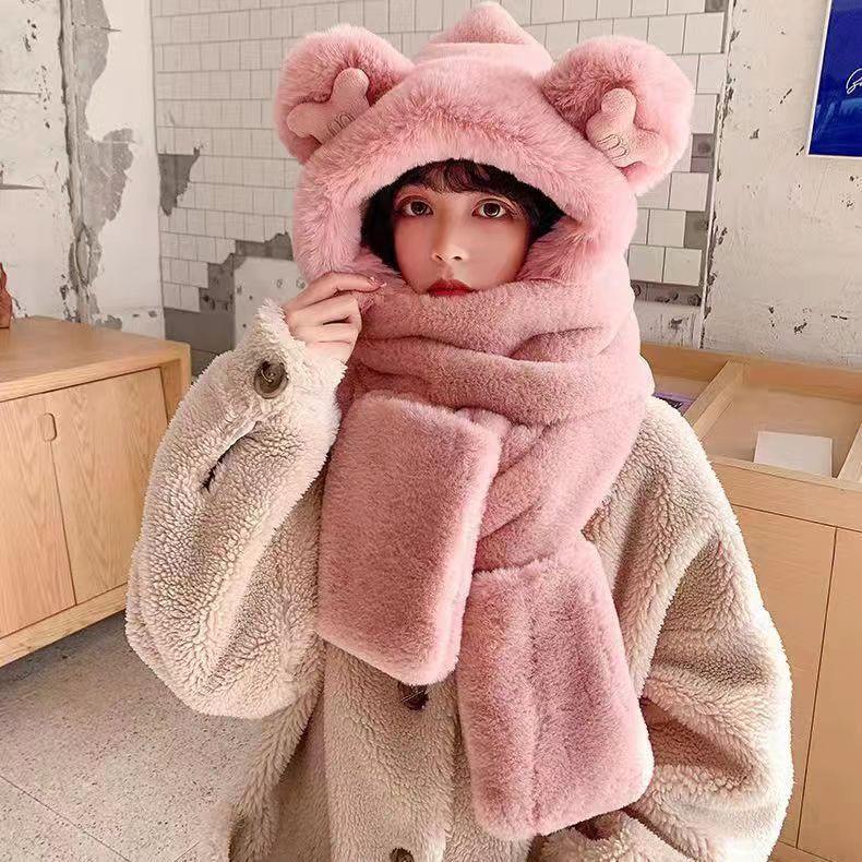 Зимняя бархатная утолщенная милая шапка с медвежонком, шарф, перчатки 3 в 1, теплые