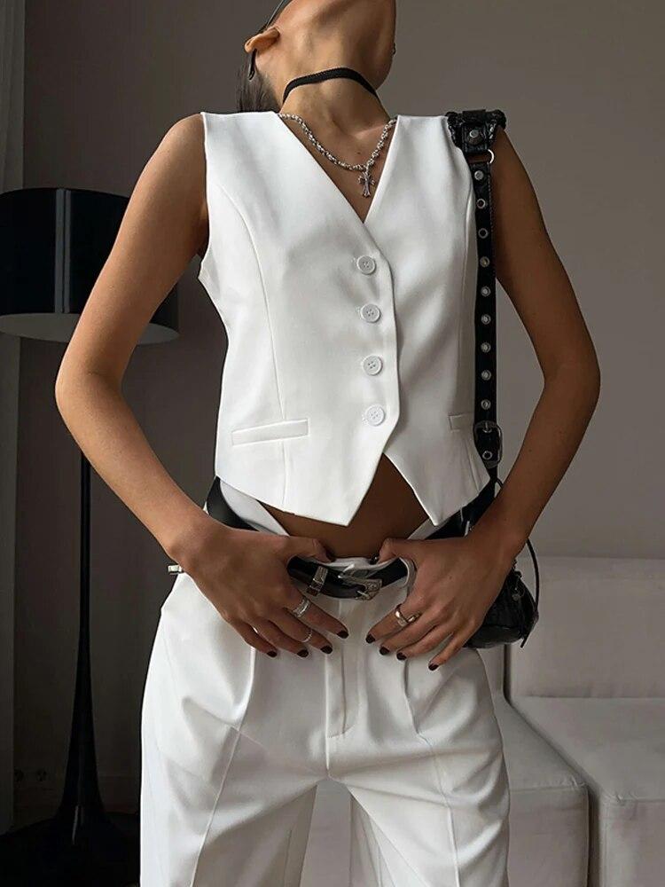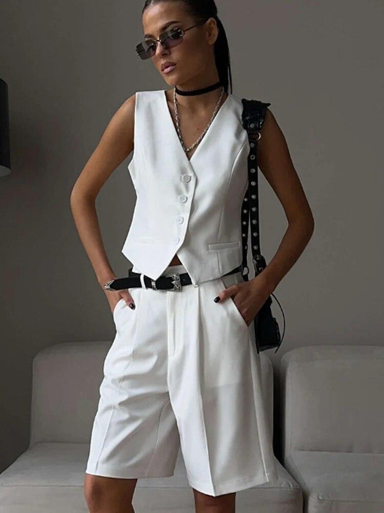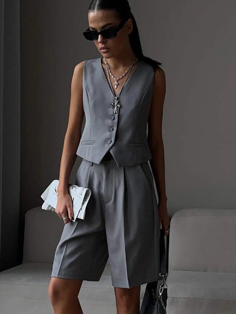 Женские костюмы, шорты, комплекты с v-образным вырезом, однобортный повседневный жилет, женский костюм из 2 предметов, прямые брюки с высокой талией, женские офисные наряды