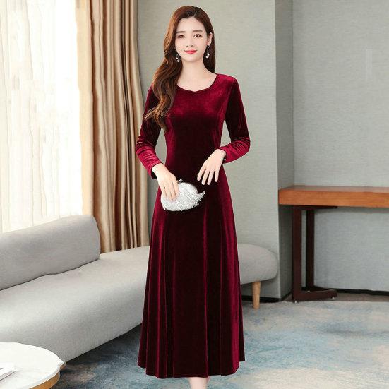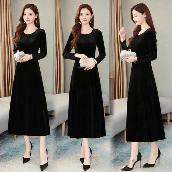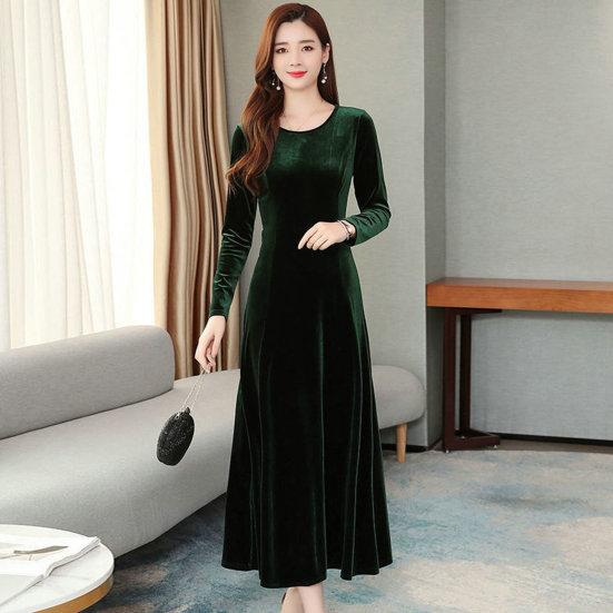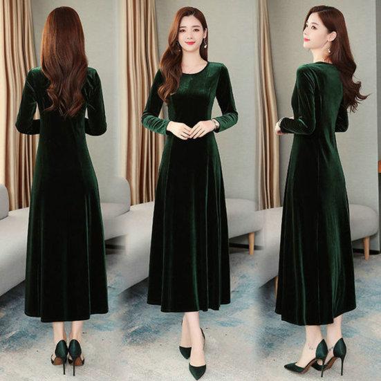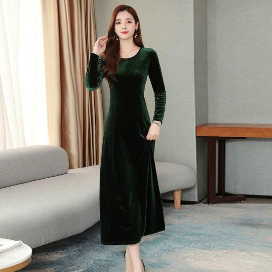 Золотистое бархатное платье с круглым вырезом и длинными рукавами, универсальное и модное.