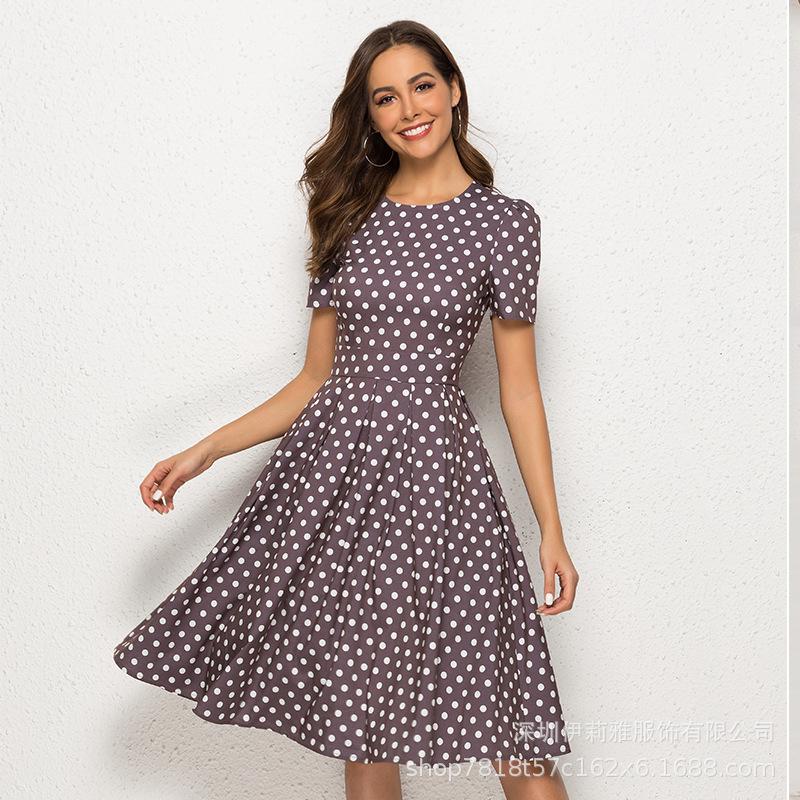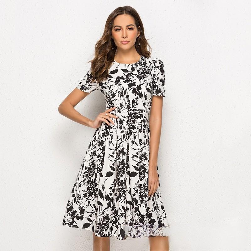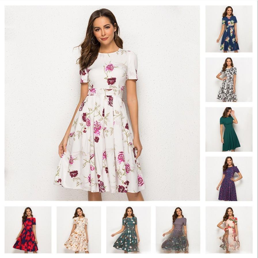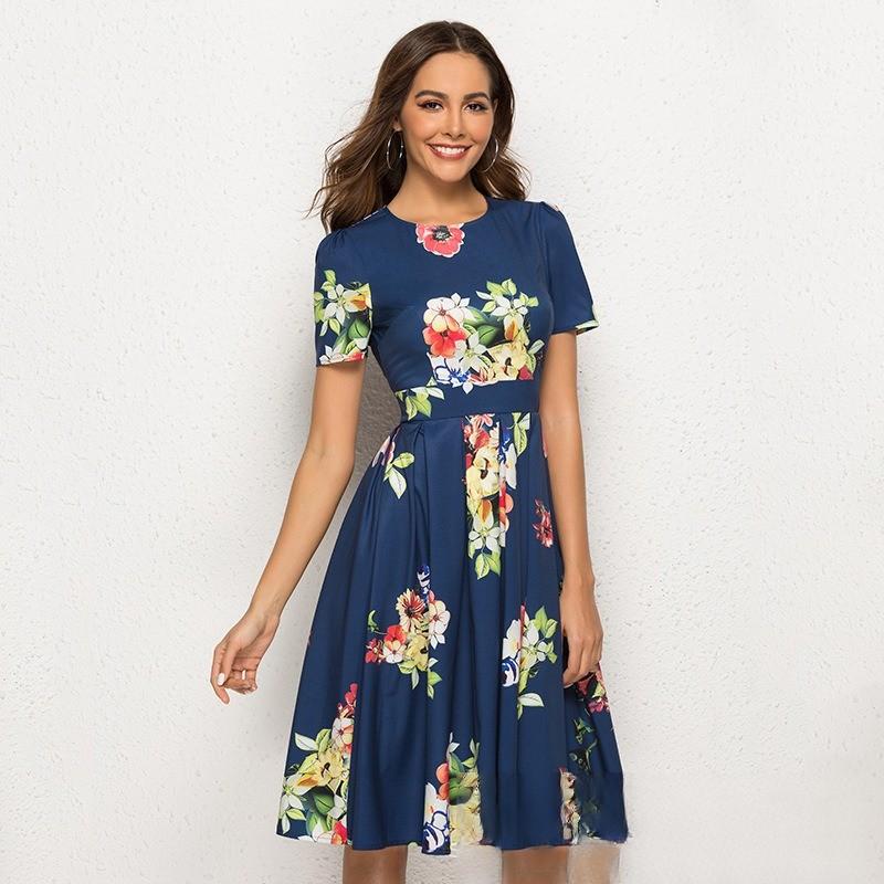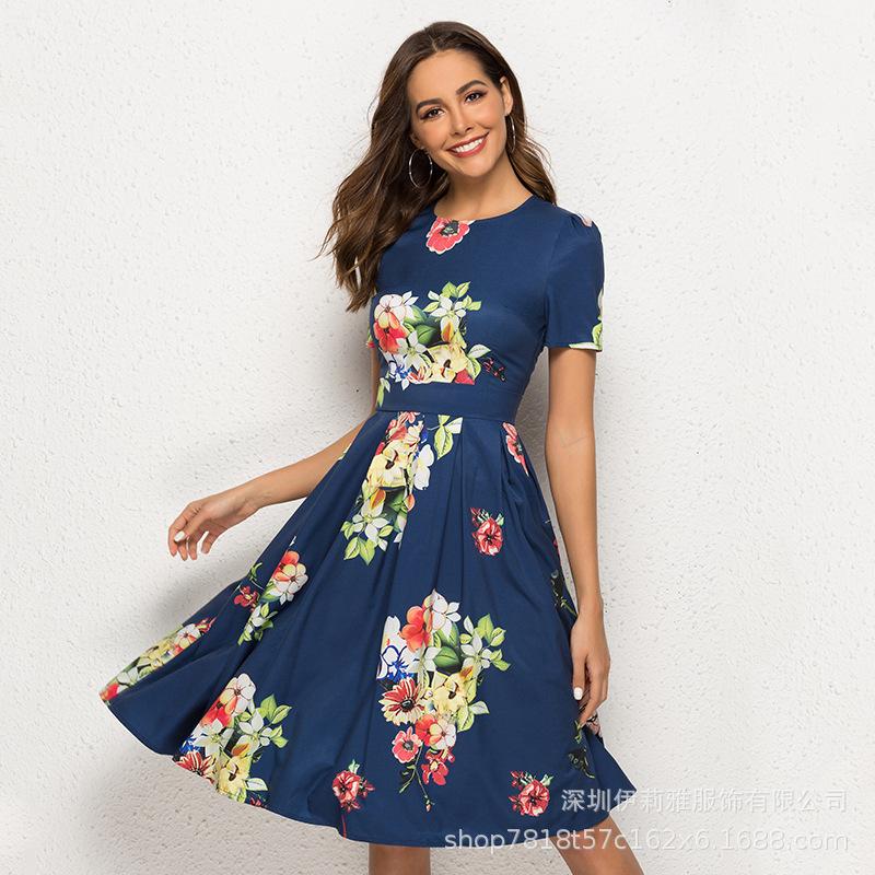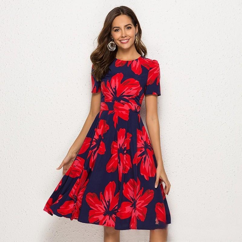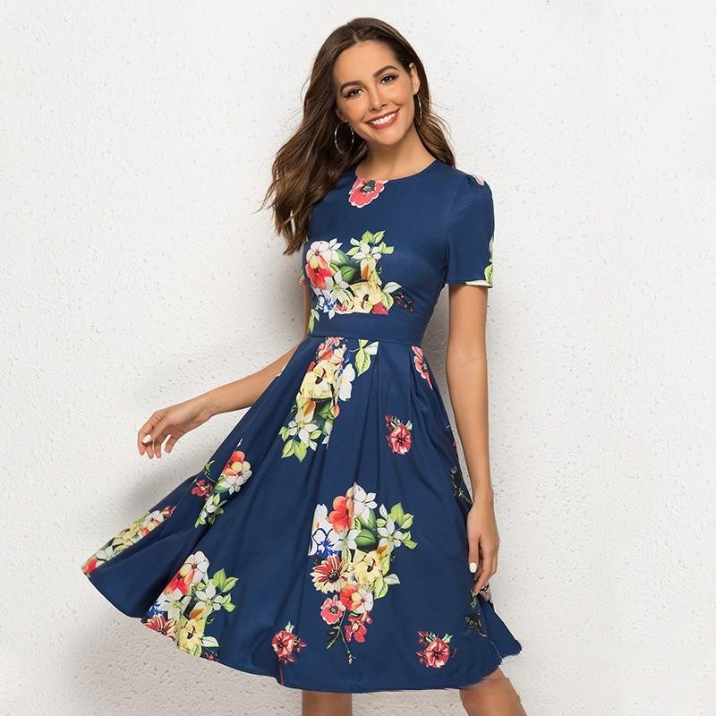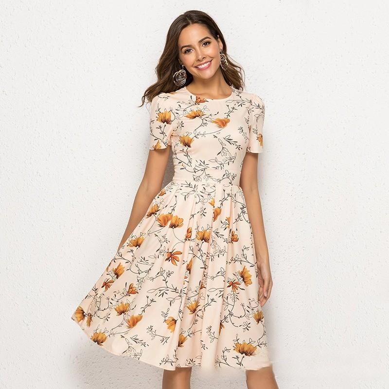 Женское платье А-силуэта в стиле ретро, маленькое платье с короткими рукавами и круглым вырезом с цветочным принтом