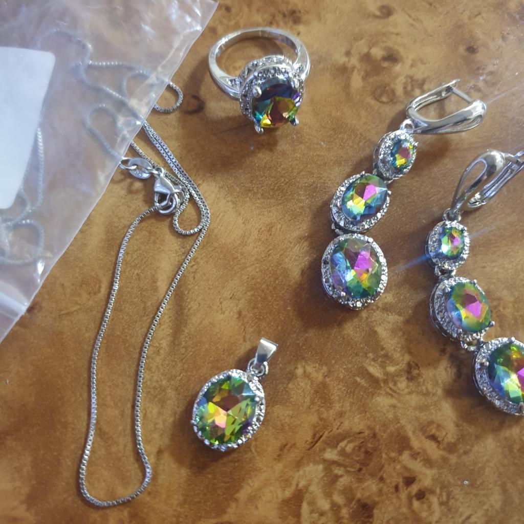 Набор пришел быстро, в Беларусь за месяц, весь окуратненький красивый, единственный минус, кулон точно такого же размера как серьги, на фото кулон значительно больше