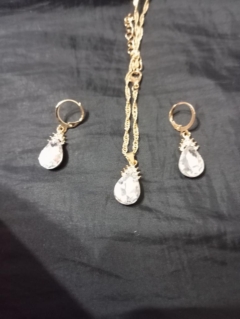 Неплохой комплект за такую цену.Стразы, и правда ,приклеены криво.Ц епочка короткая,думала,что будет длиннее