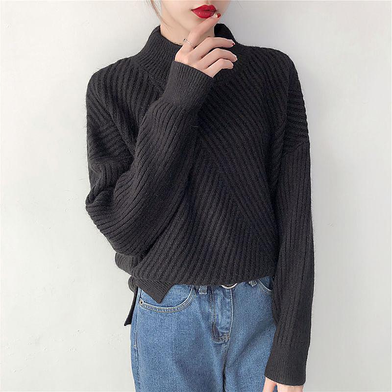 Осенне-зимний женский свитер, пуловер, вязаный свитер с полувысоким воротником, свободный круглый вырез, однотонная нижняя рубашка с длинными рукавами в диагональную полоску — купить товар онлайн с бесплатной доставкой по всему миру!