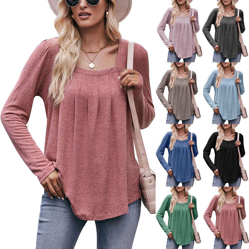 Женская осенне-зимняя плиссированная футболка с длинными рукавами и квадратным вырезом с пузырьковыми рукавами