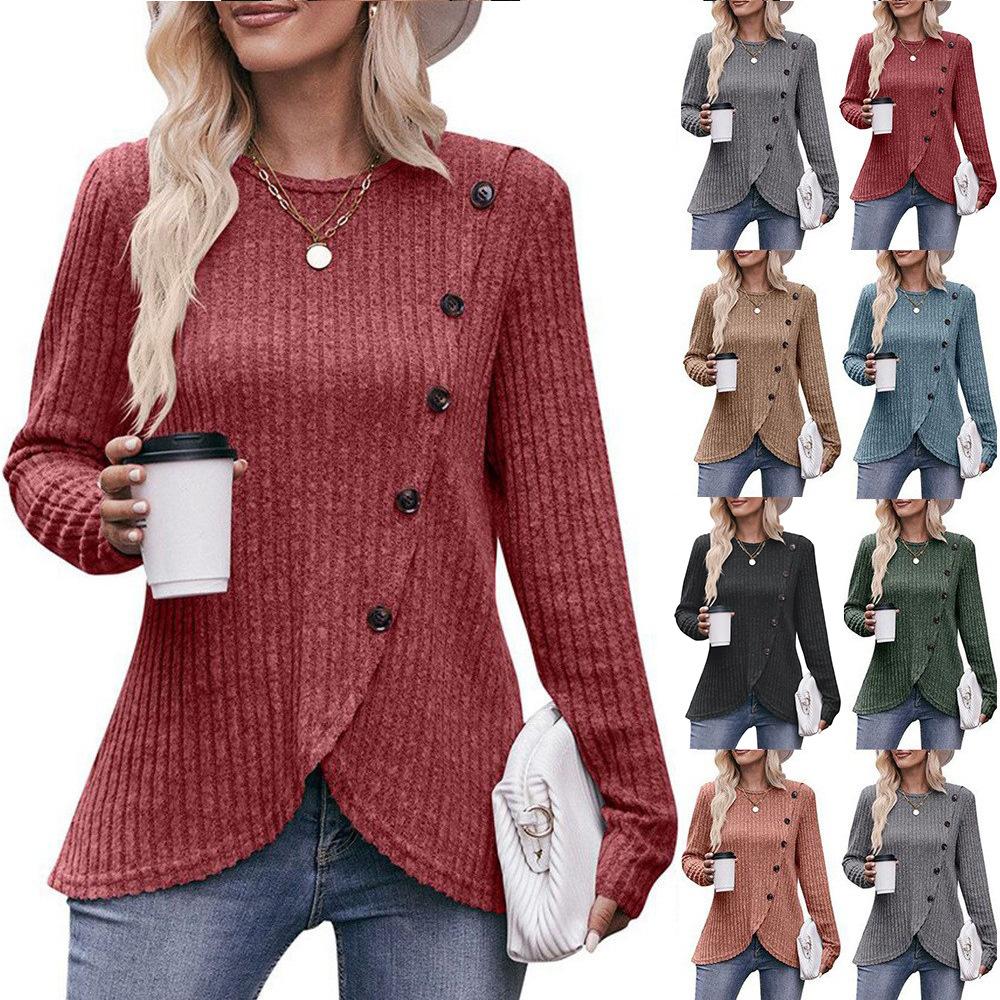 Женская эластичная трикотажная футболка с круглым вырезом в рубчик, модная однотонная футболка на пуговицах с нерегулярным низом — купить товар онлайн с бесплатной доставкой по всему миру!